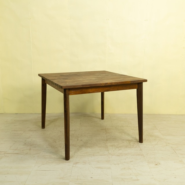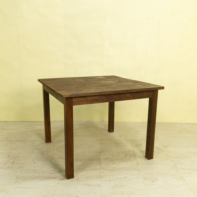 【商品詳細】 チークブロックテーブル B / ASR-1027C-3G〈Teak Block Table B(KD)〉は、チークのベンチ古材を再利用し、モザイク状に組み上げて製作したダイニングテーブルです。 使用しているチーク材は、インドネシア現地で「ディングレ」と呼ばれる背のないベンチの古材です。ディングレは、かつてジャワの多くの家庭や食堂で日常的に使われていた、非常にポピュラーなインテリアでした。本製品は、その歴史あるベンチ材の短い端材を天板へと再生した、サステナブルなプロダクトです。 天板に施されたモザイク模様は、独自のデザインによるもの。チークならではの豊かな木目や色味の濃淡が織りなす美しいパターンが、空間に温もりと個性をもたらします。リビングやダイニングのアクセントとして、印象的な存在感を放ちます。 高品質なチーク材を使用し、耐久性と安定感を重視した設計のため、日常使いにも安心してお使いいただけます。洗練されたシンプルなフォルムは、ナチュラル、モダン、ヴィンテージなど、さまざまなインテリアスタイルと調和し、心地よい空間を演出します。 お茶や食事を楽しむテーブルとしてはもちろん、雑貨や書籍を美しくディスプレイする場としても活躍する、多機能で魅力あふれる一台です。 【仕上げ / Finish】 オイル仕上げ / Oil Finish 【素材 / Material】 チーク古材 / Old Teak Wood 【サイズ】 幅(w) 100cm x 奥行(d) 100cm x 高さ(h) 75cm *ノックダウン式のテーブルです。 *沖縄・離島の送料はお見積りになります。ご購入前にお問い合わせください。 *Shipping costs for Okinawa and remote islands are estimates. Please contact us before purchasing。