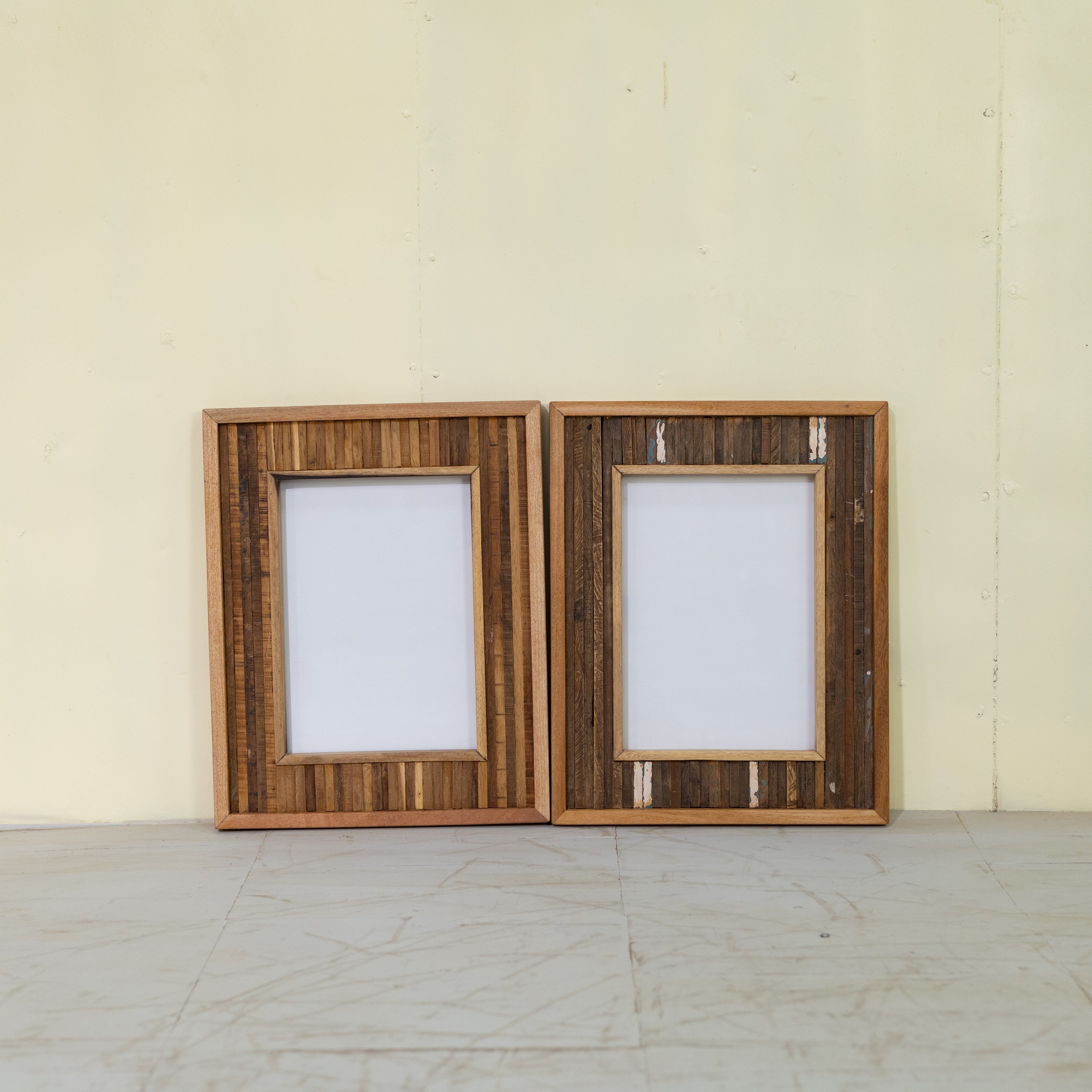 古材チークを一本一本カットして組み合わせた、モザイク模様のポスターフレーム。