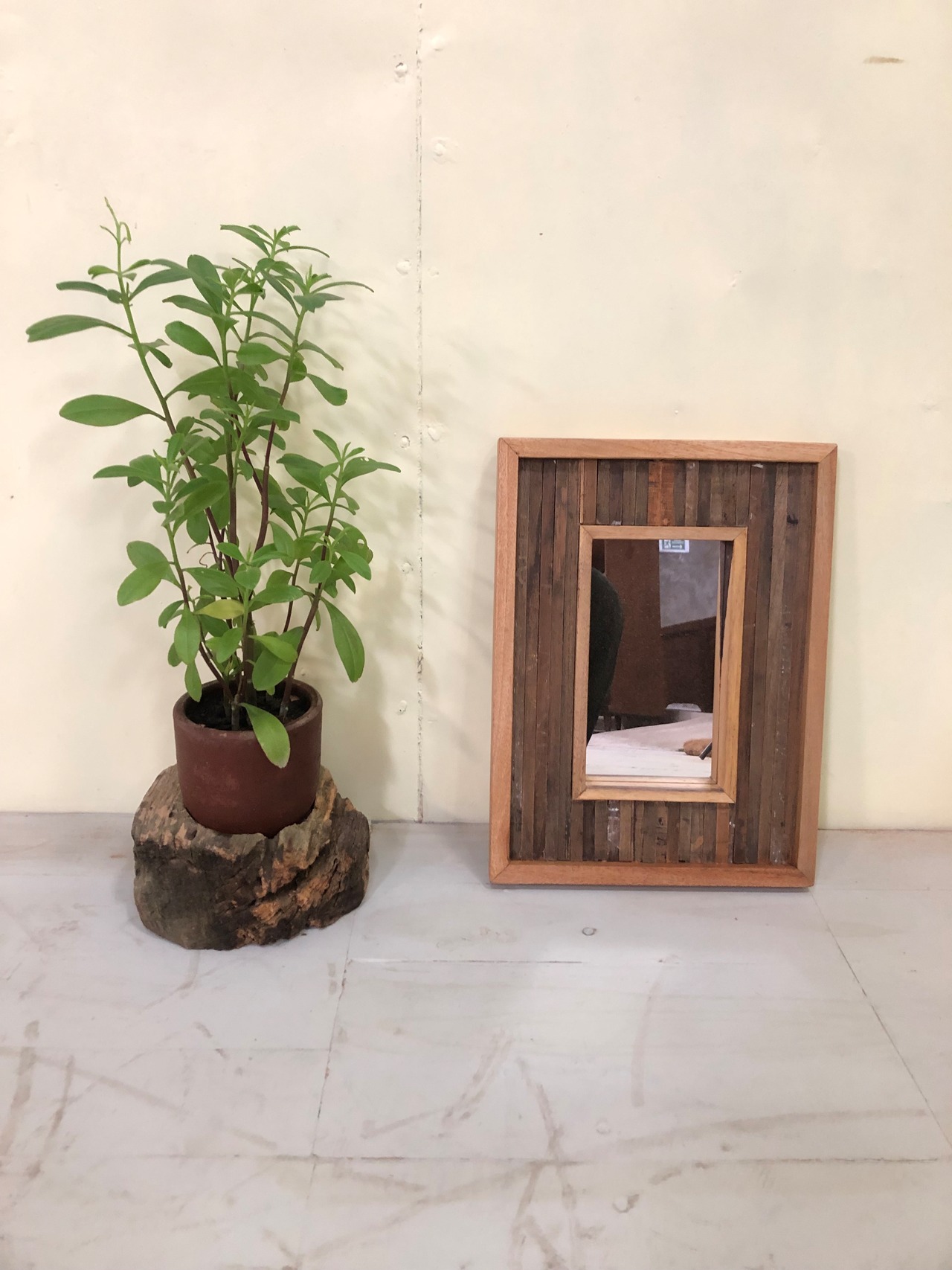 古材チークを一本一本丁寧にカットし、組み合わせて仕上げたモザイク模様のウォールミラー。