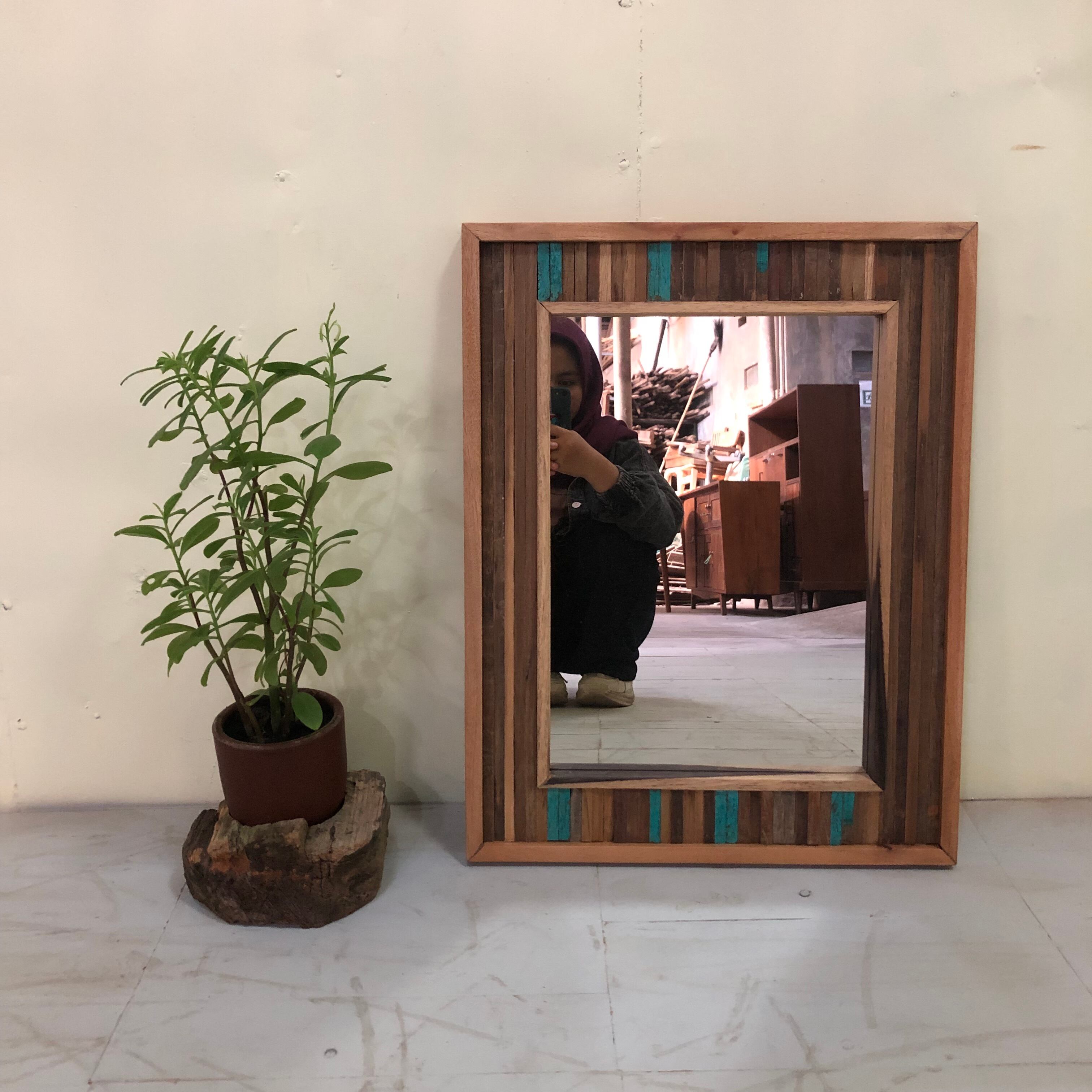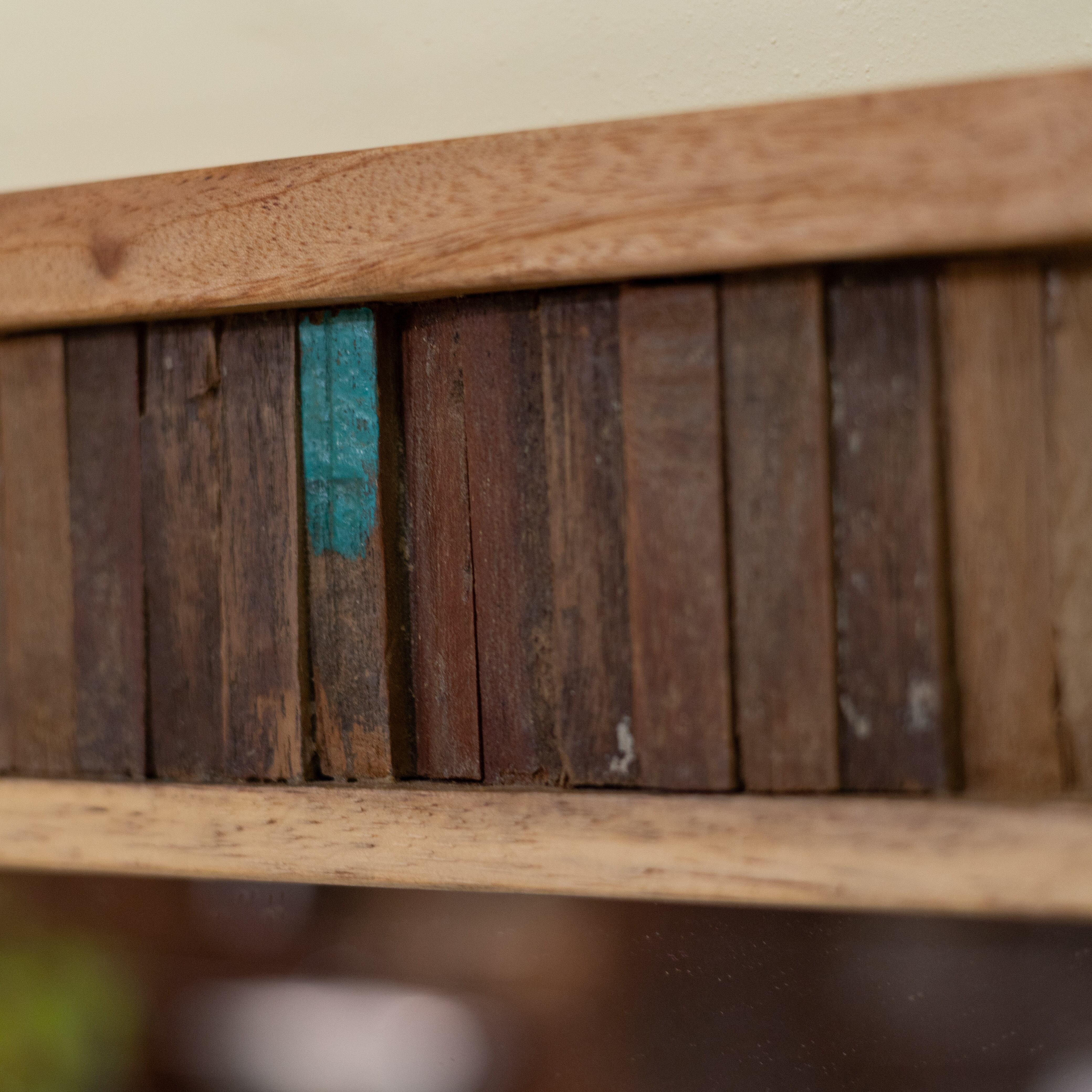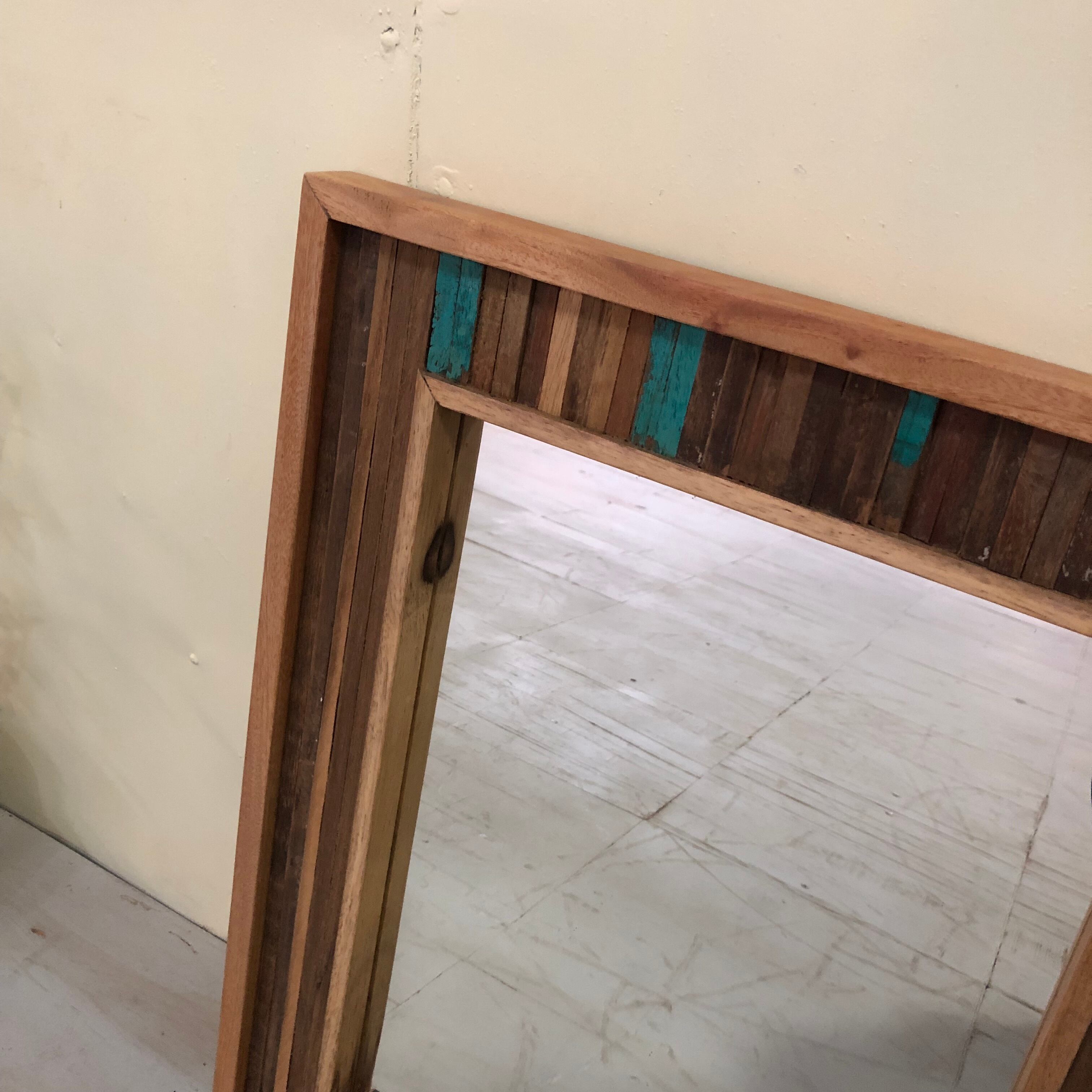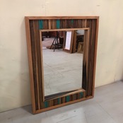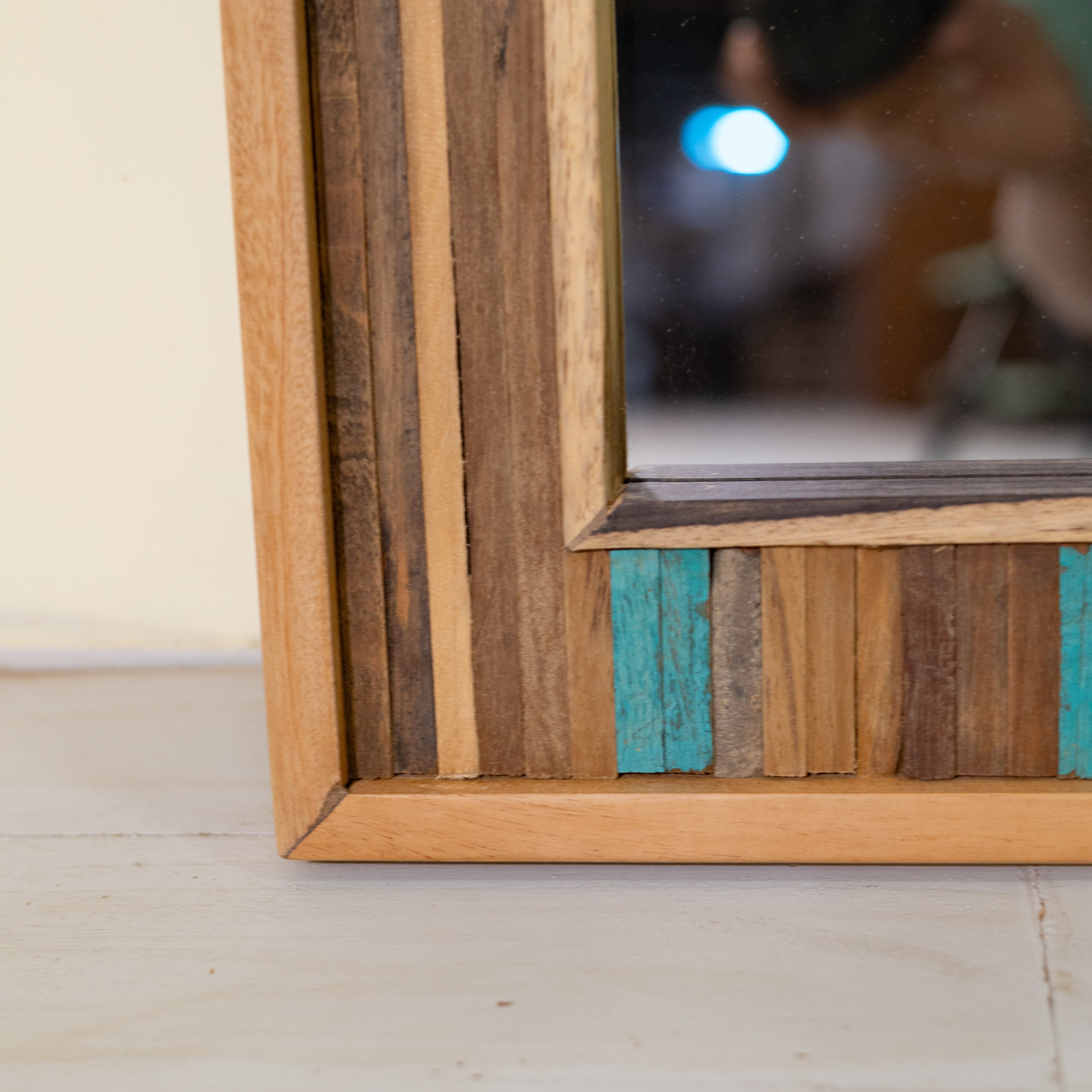 古材チークを一本一本丁寧にカットし、組み合わせて仕上げたモザイク模様のウォールミラー。