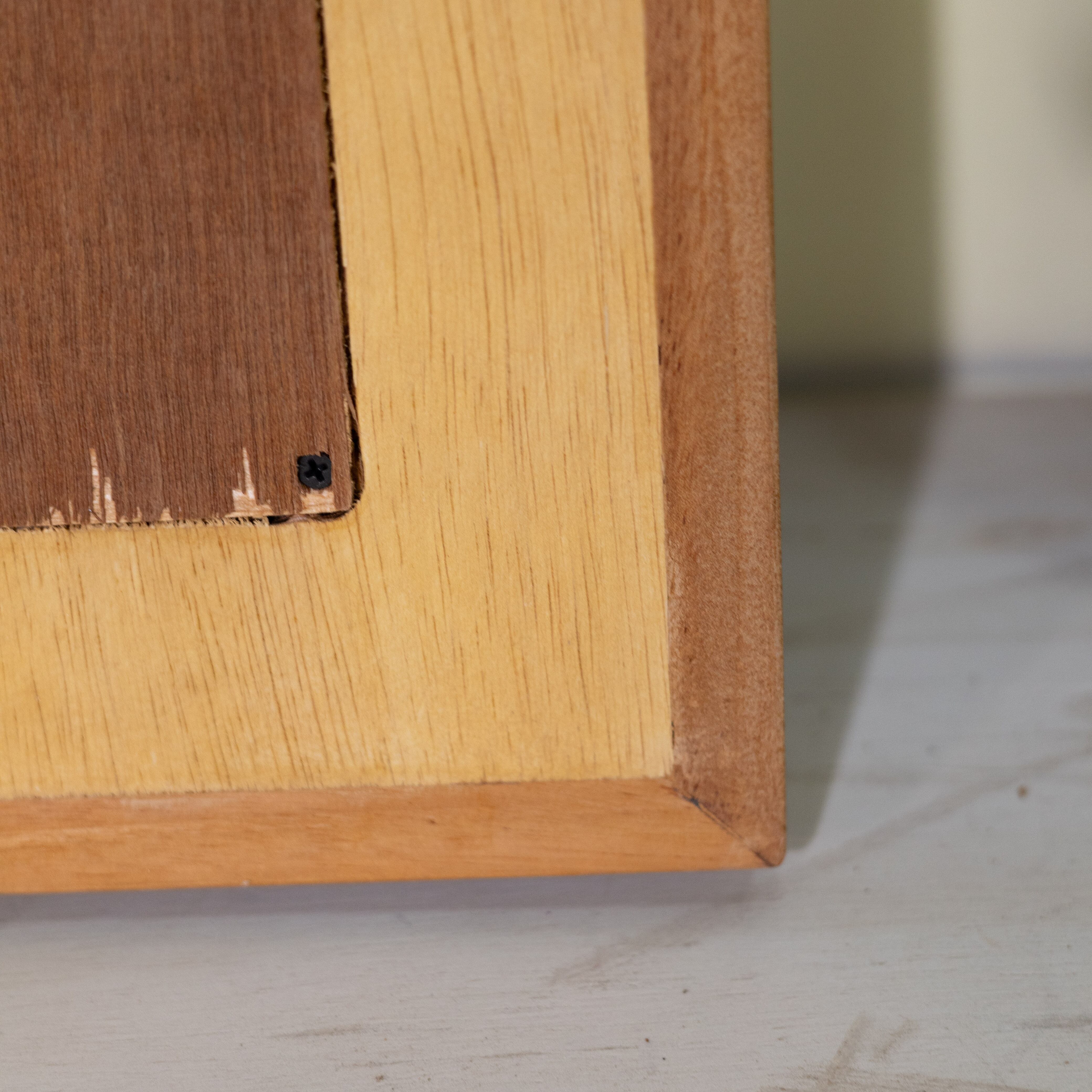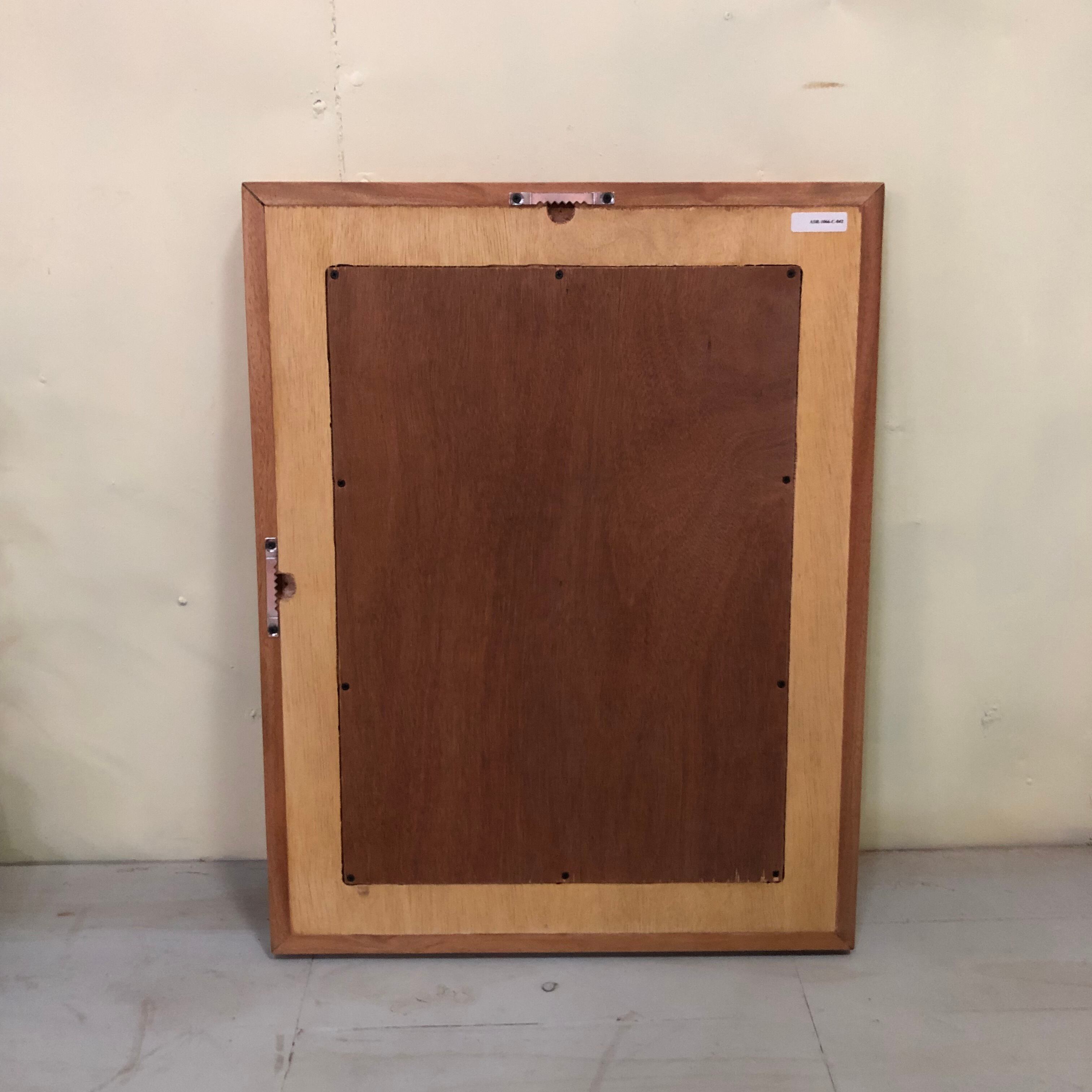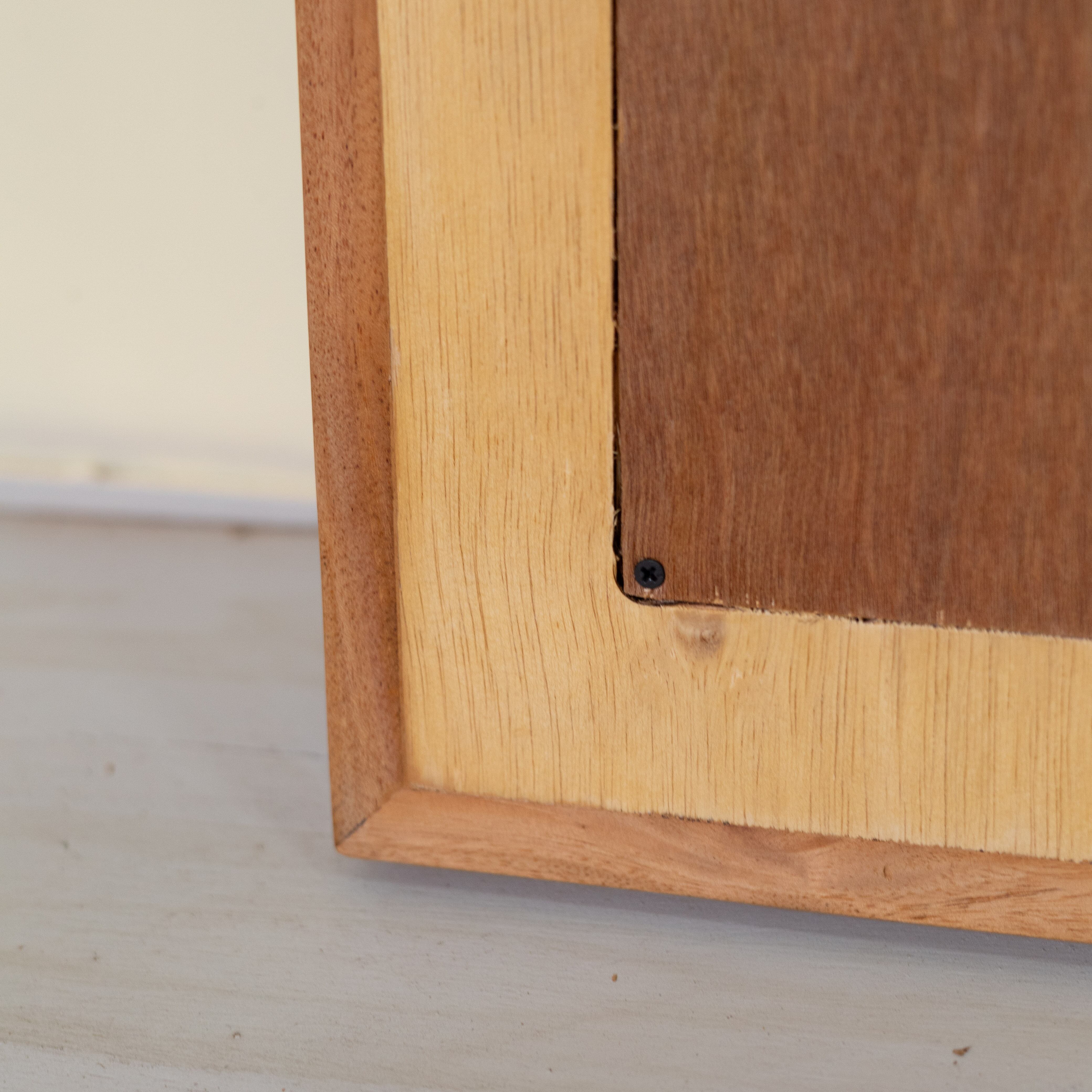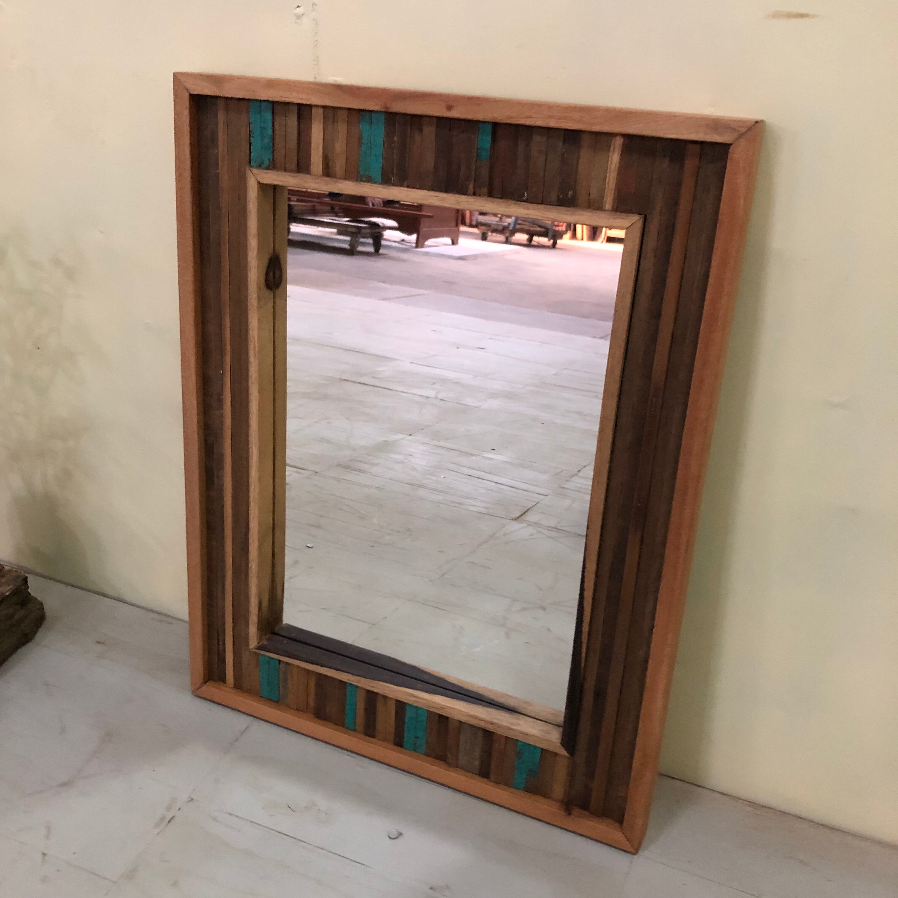 古材チークを一本一本丁寧にカットし、組み合わせて仕上げたモザイク模様のウォールミラー。