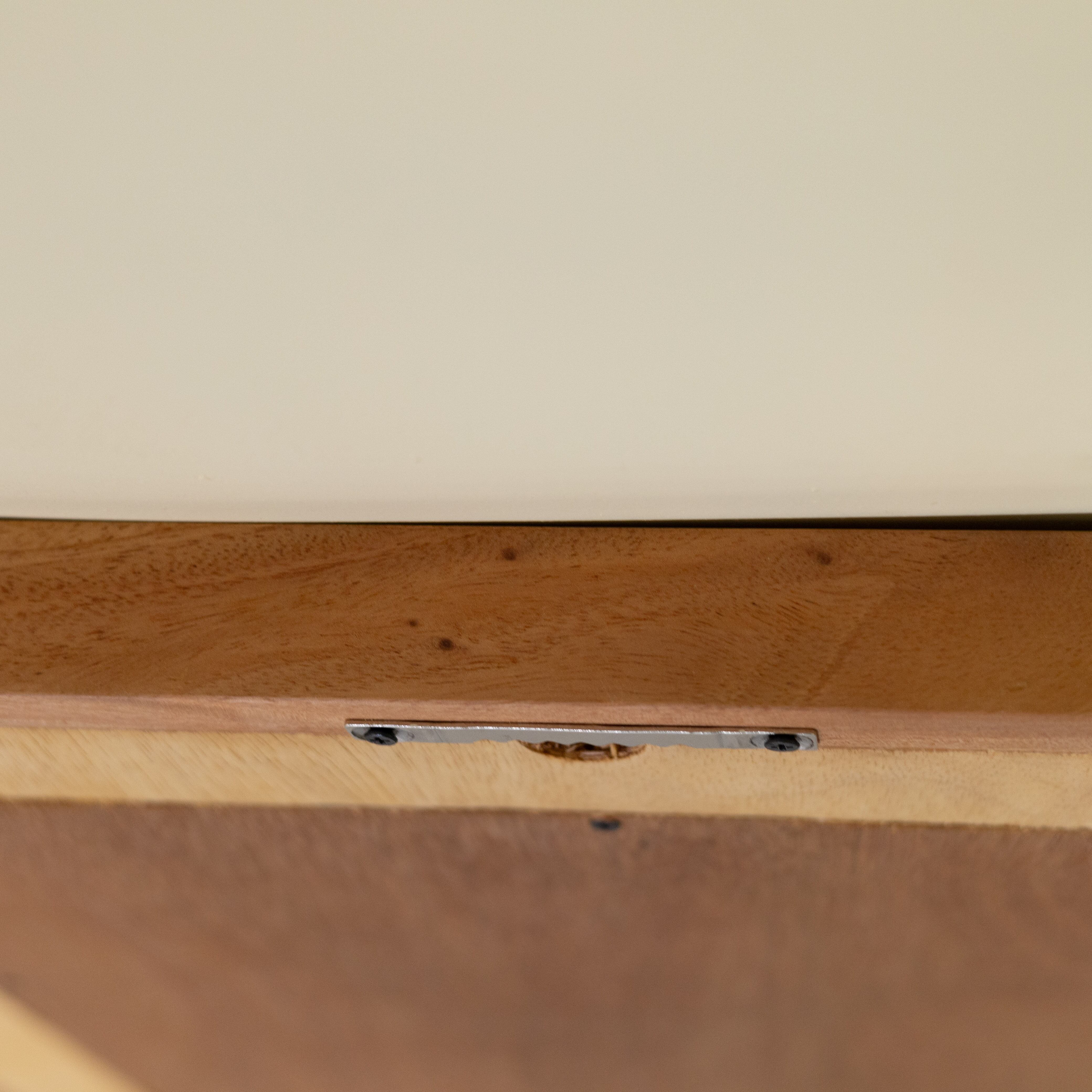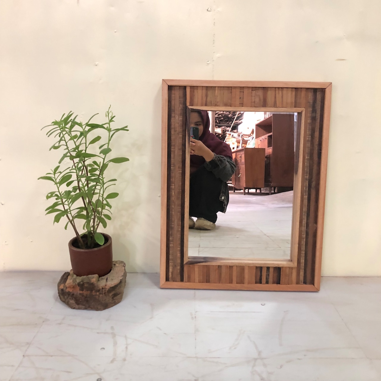 古材チークを一本一本丁寧にカットし、組み合わせて仕上げたモザイク模様のウォールミラー。