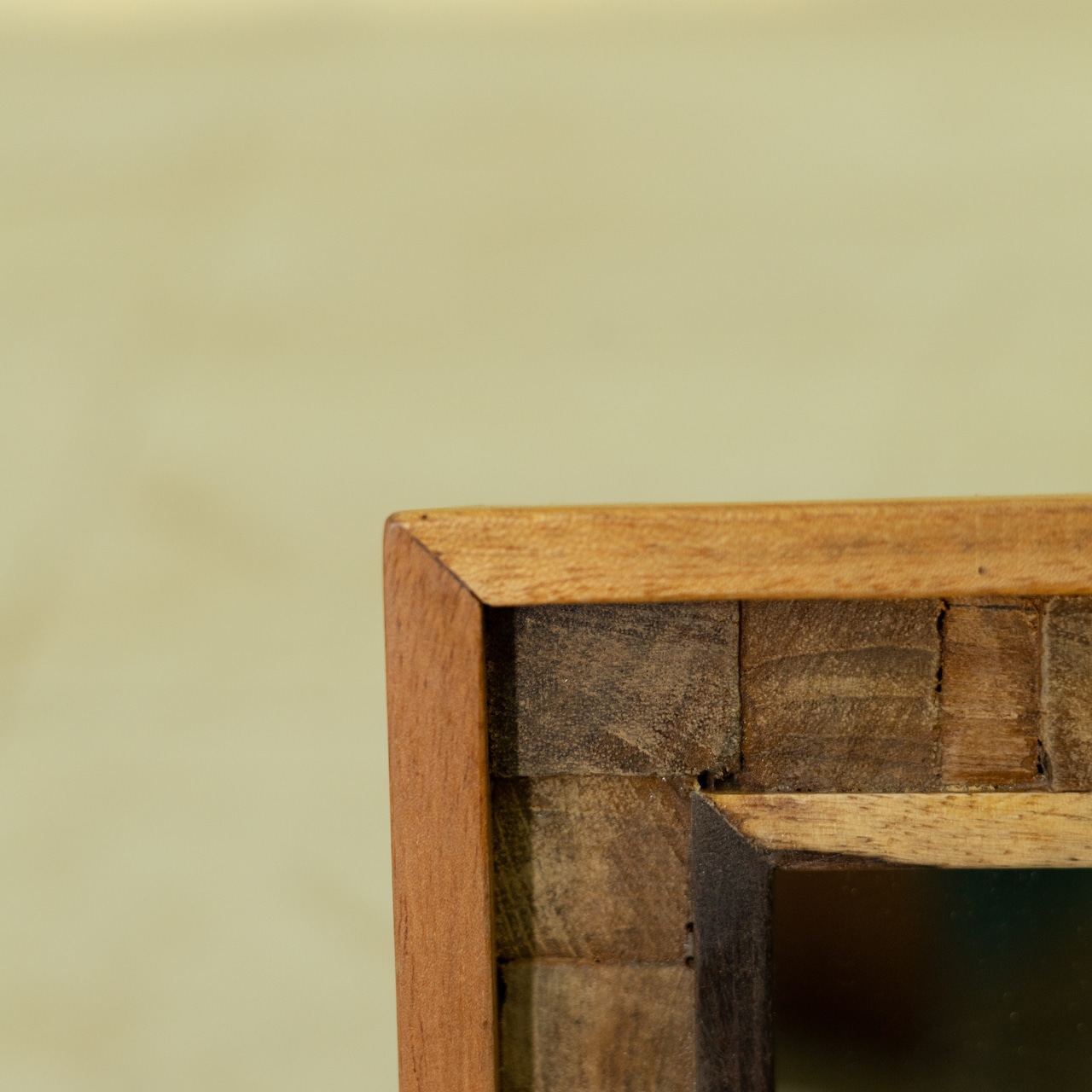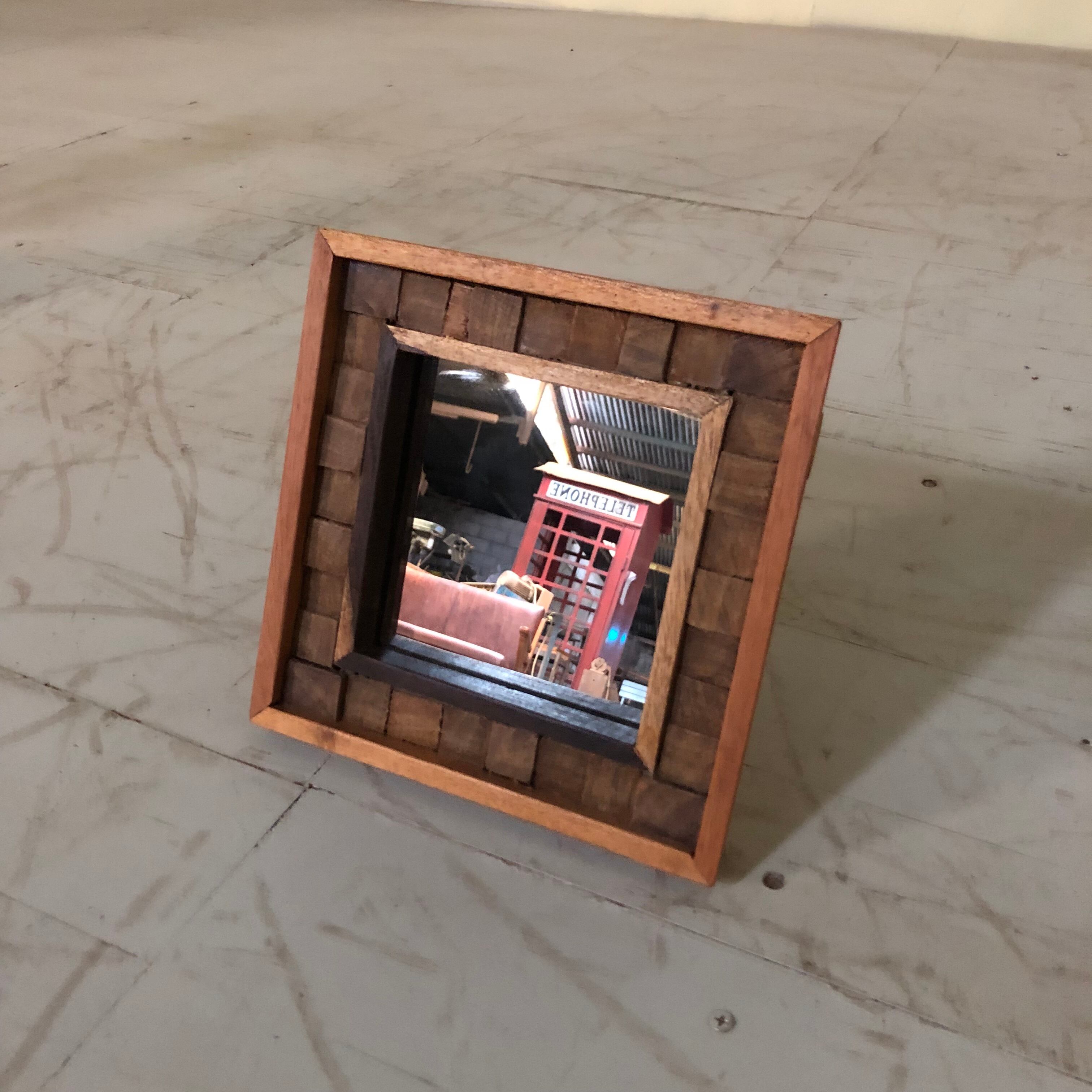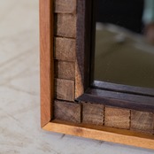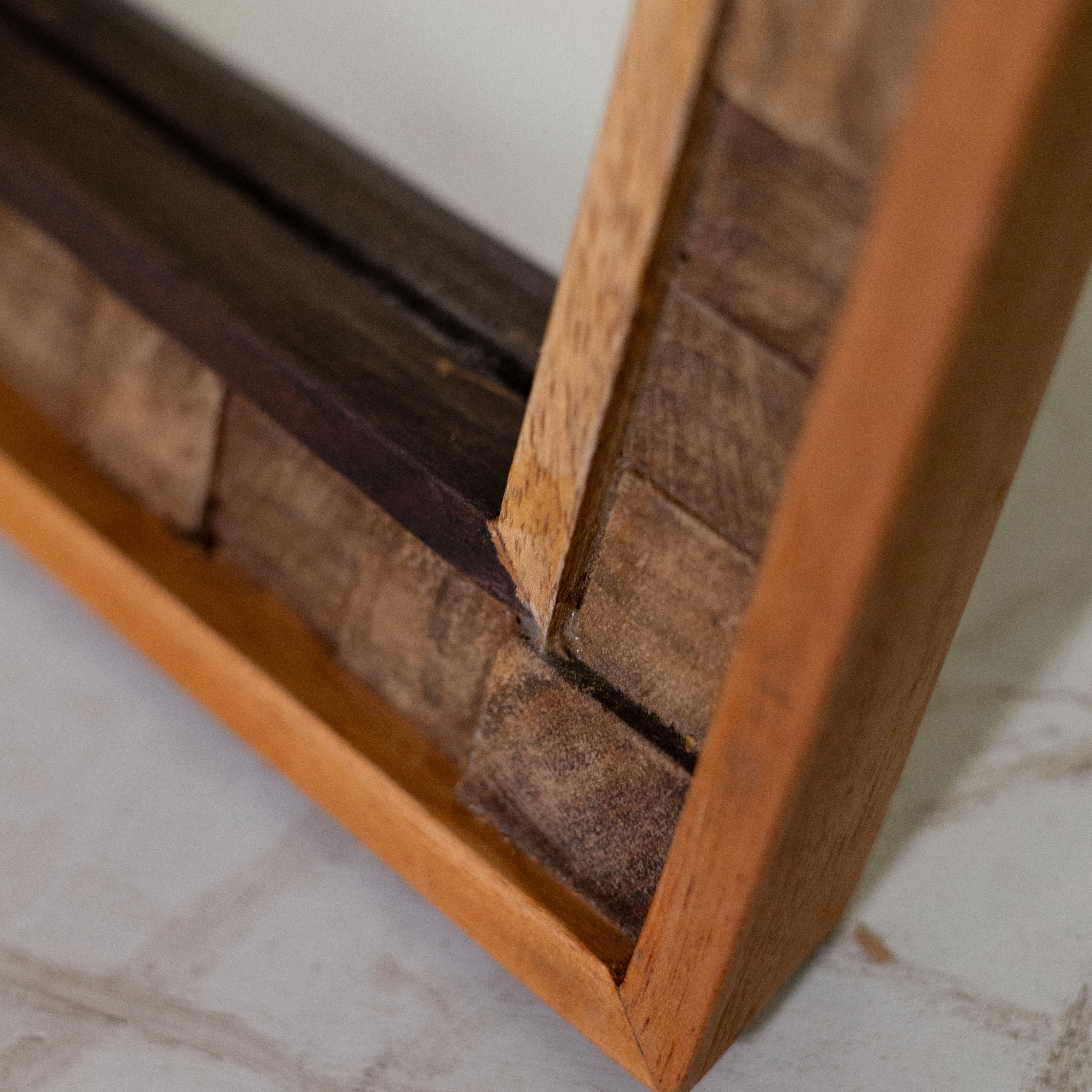 古材チークを一本一本丁寧にカットし、組み合わせて仕上げた、モザイク模様のデスクミラー。