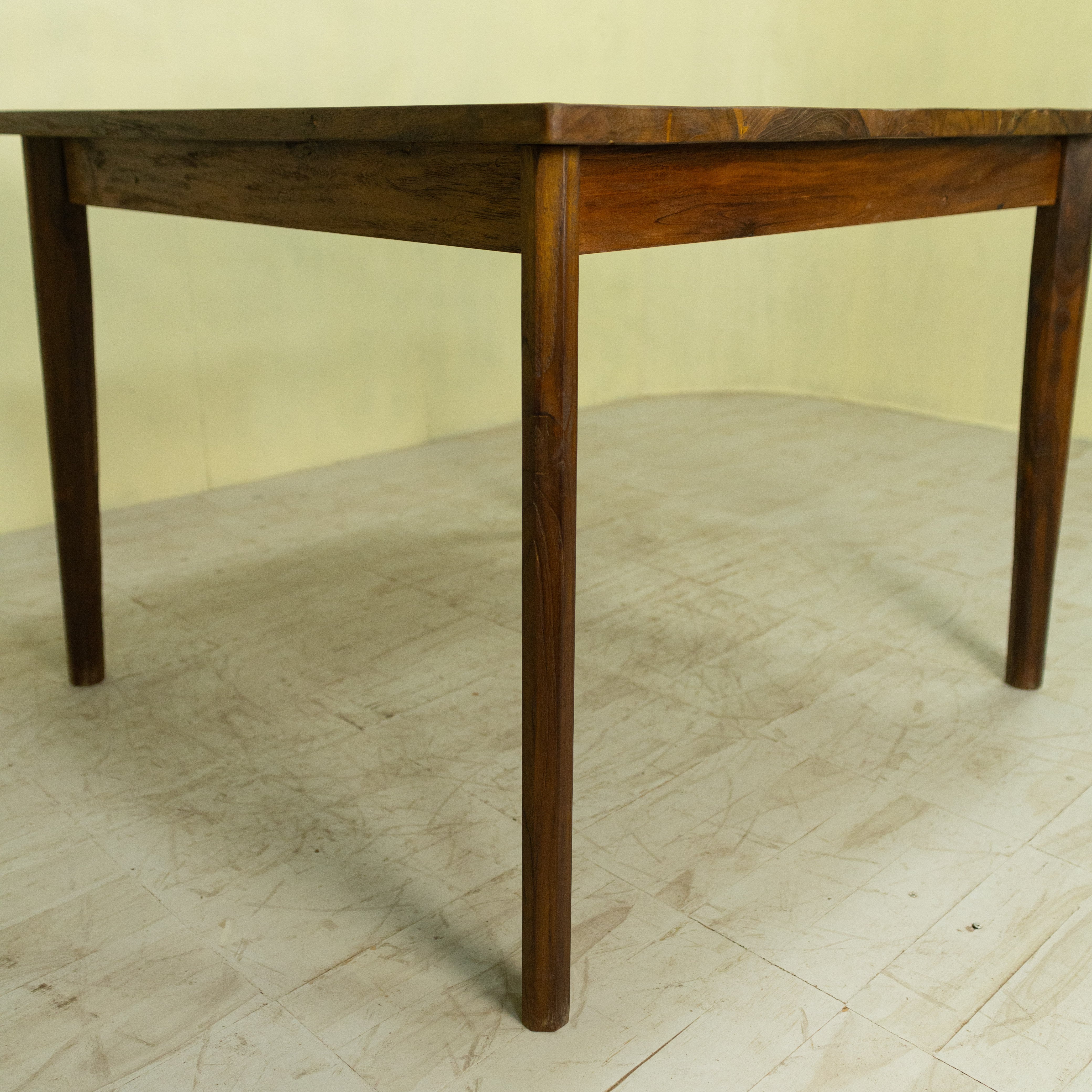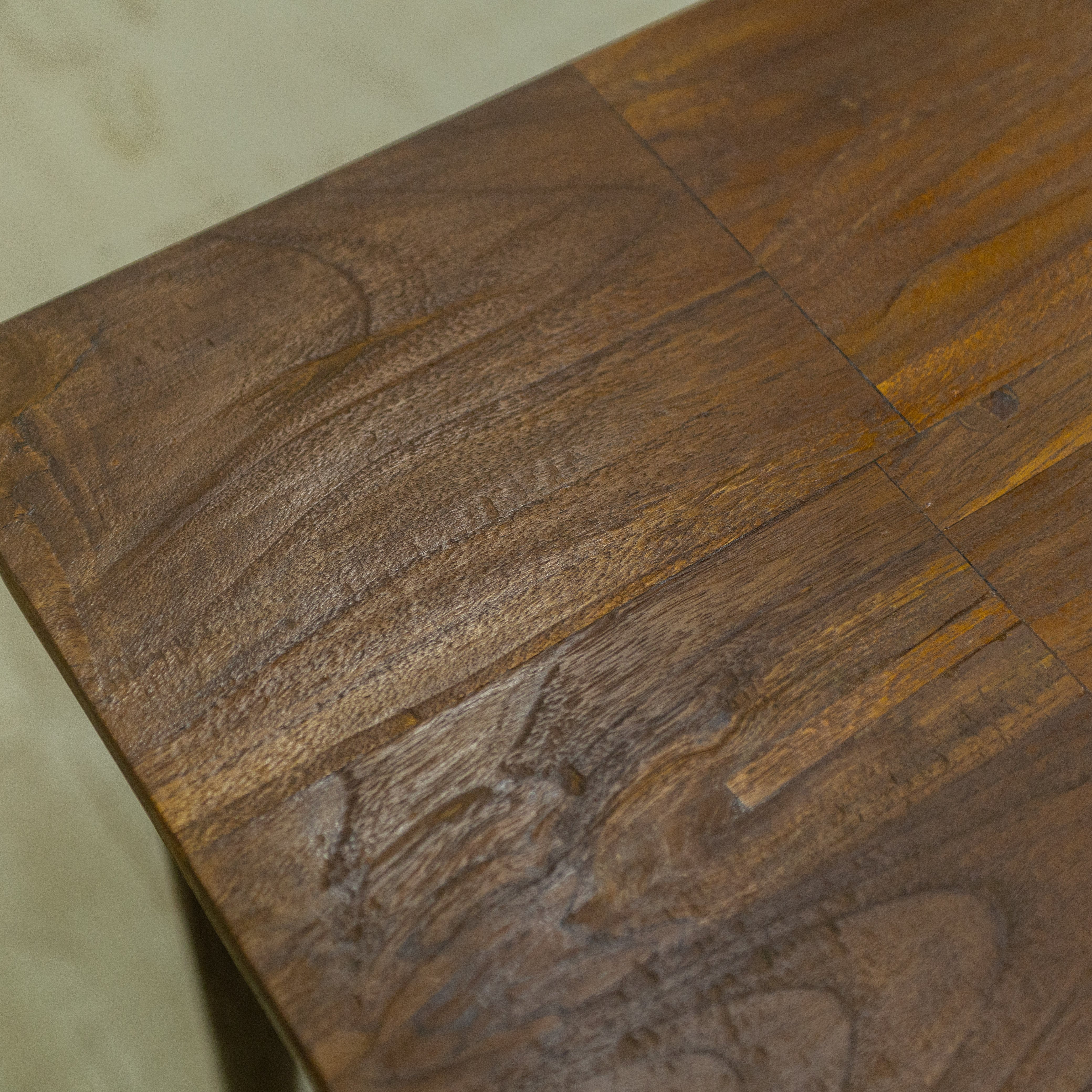 天板に施されたモザイク模様は、独自のデザインによるもの。チークならではの豊かな木目や色味の濃淡が織りなす美しいパターンが、空間に温もりと個性をもたらします。リビングやダイニングのアクセントとして、印象的な存在感を放ちます。