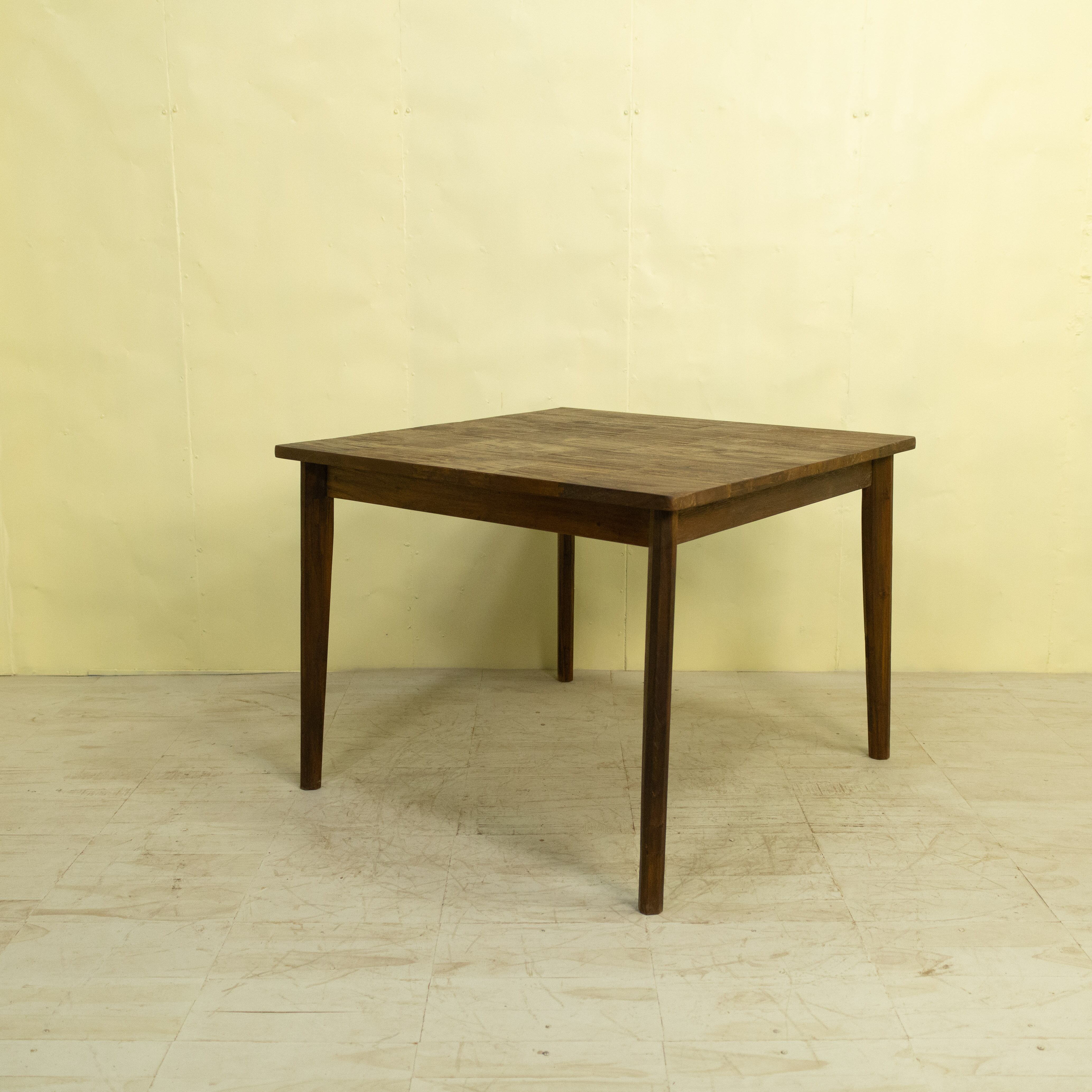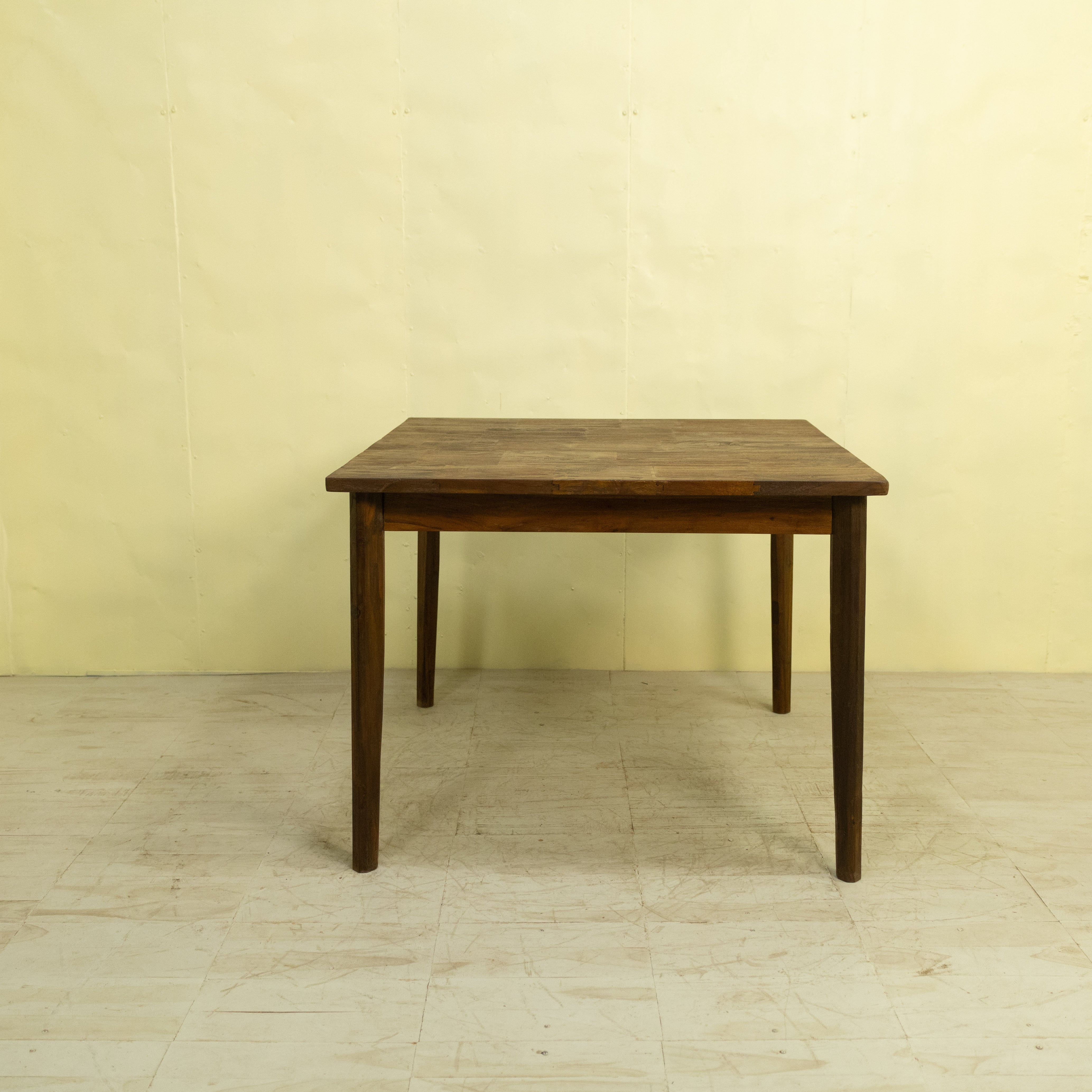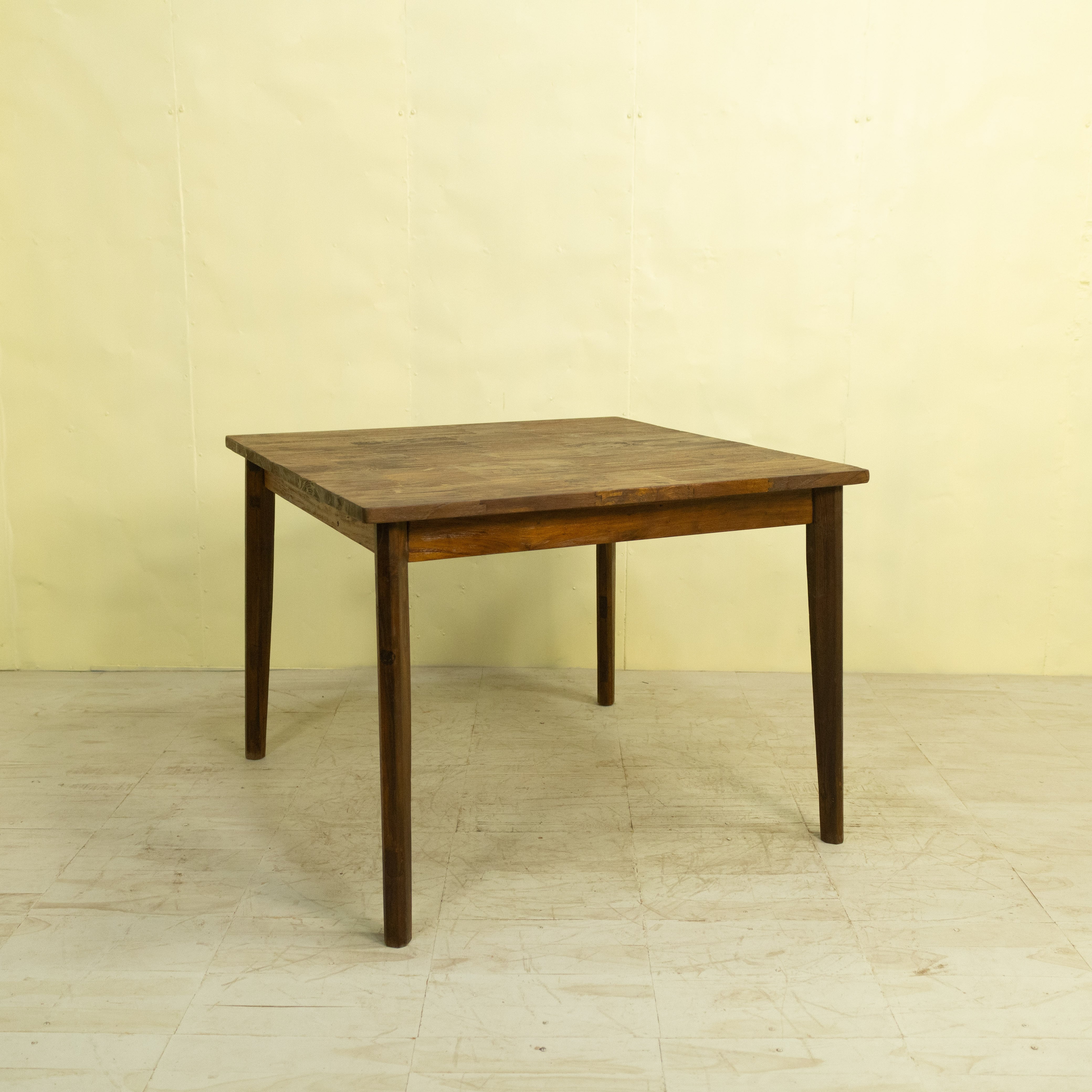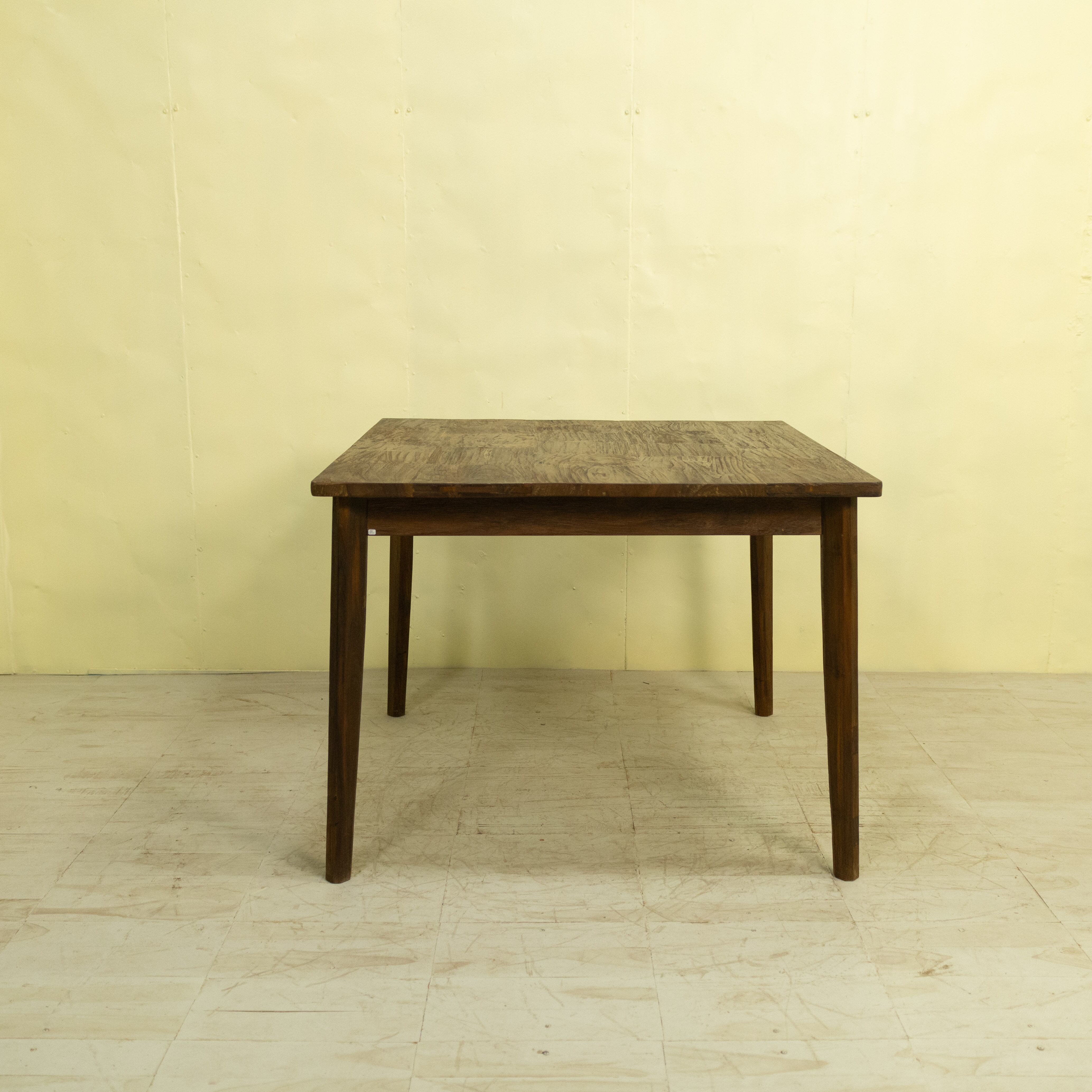 使用しているチーク材は、インドネシア現地で「ディングレ」と呼ばれる背のないベンチの古材です。ディングレは、かつてジャワの多くの家庭や食堂で日常的に使われていた、非常にポピュラーなインテリアでした。本製品は、その歴史あるベンチ材の短い端材を天板へと再生した、サステナブルなプロダクトです。