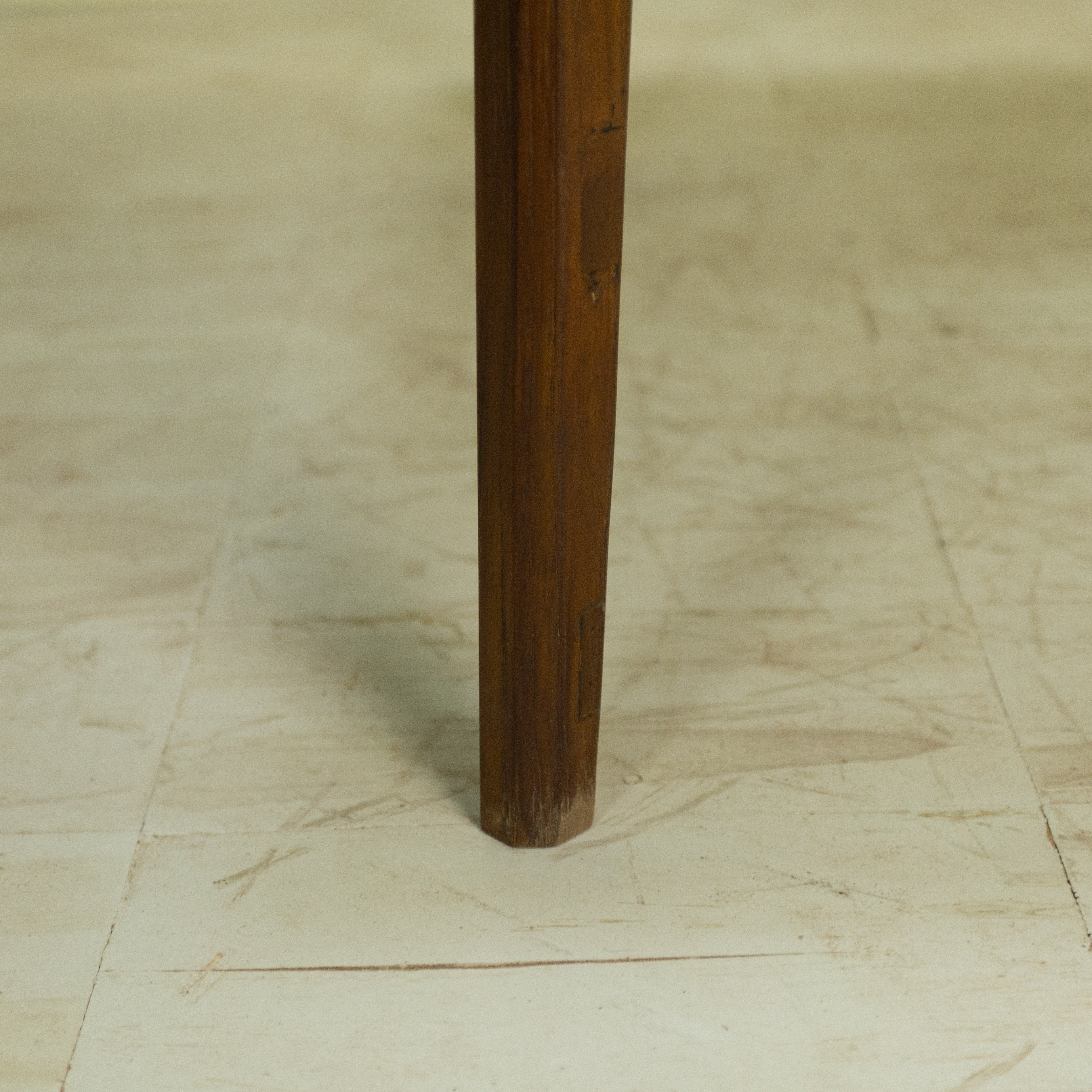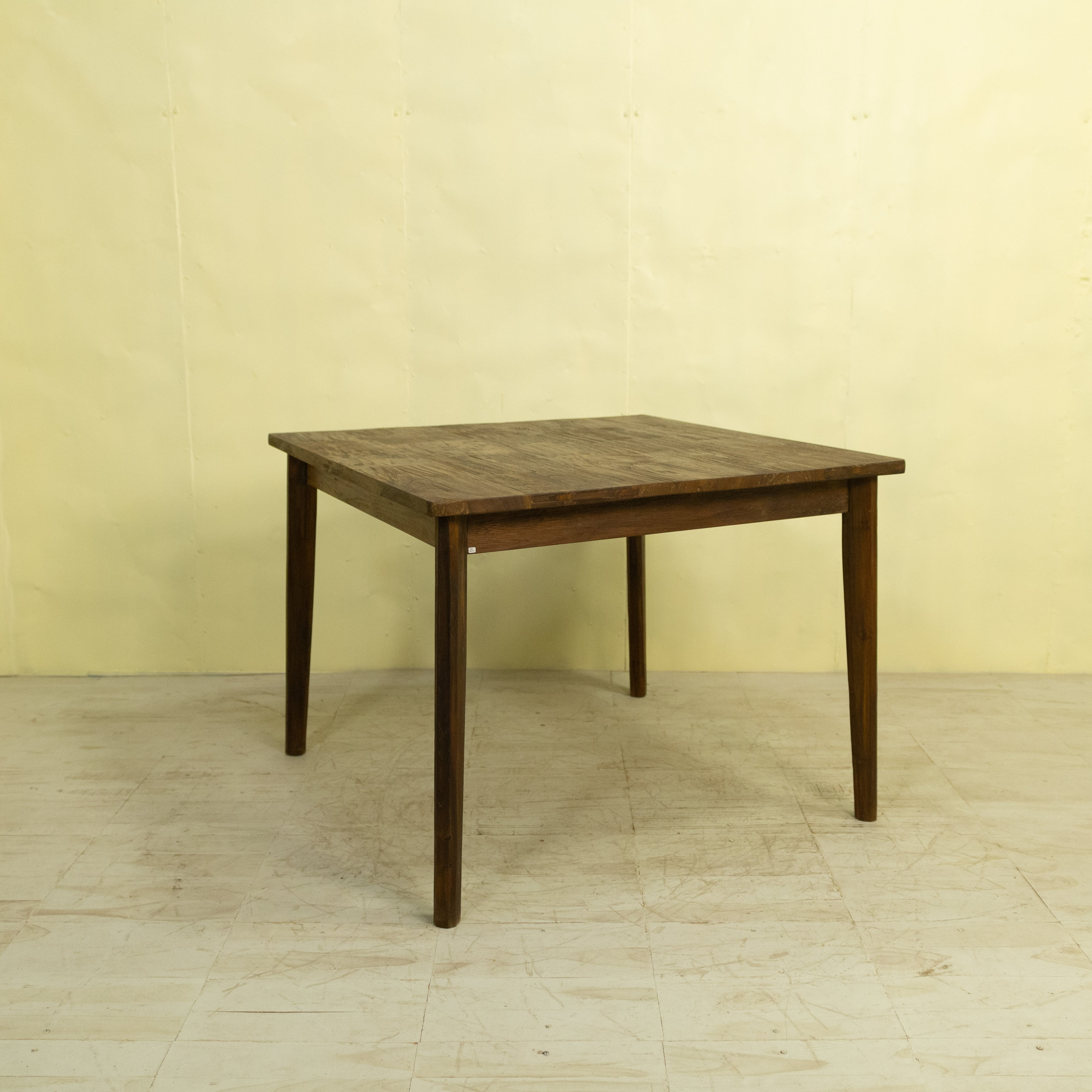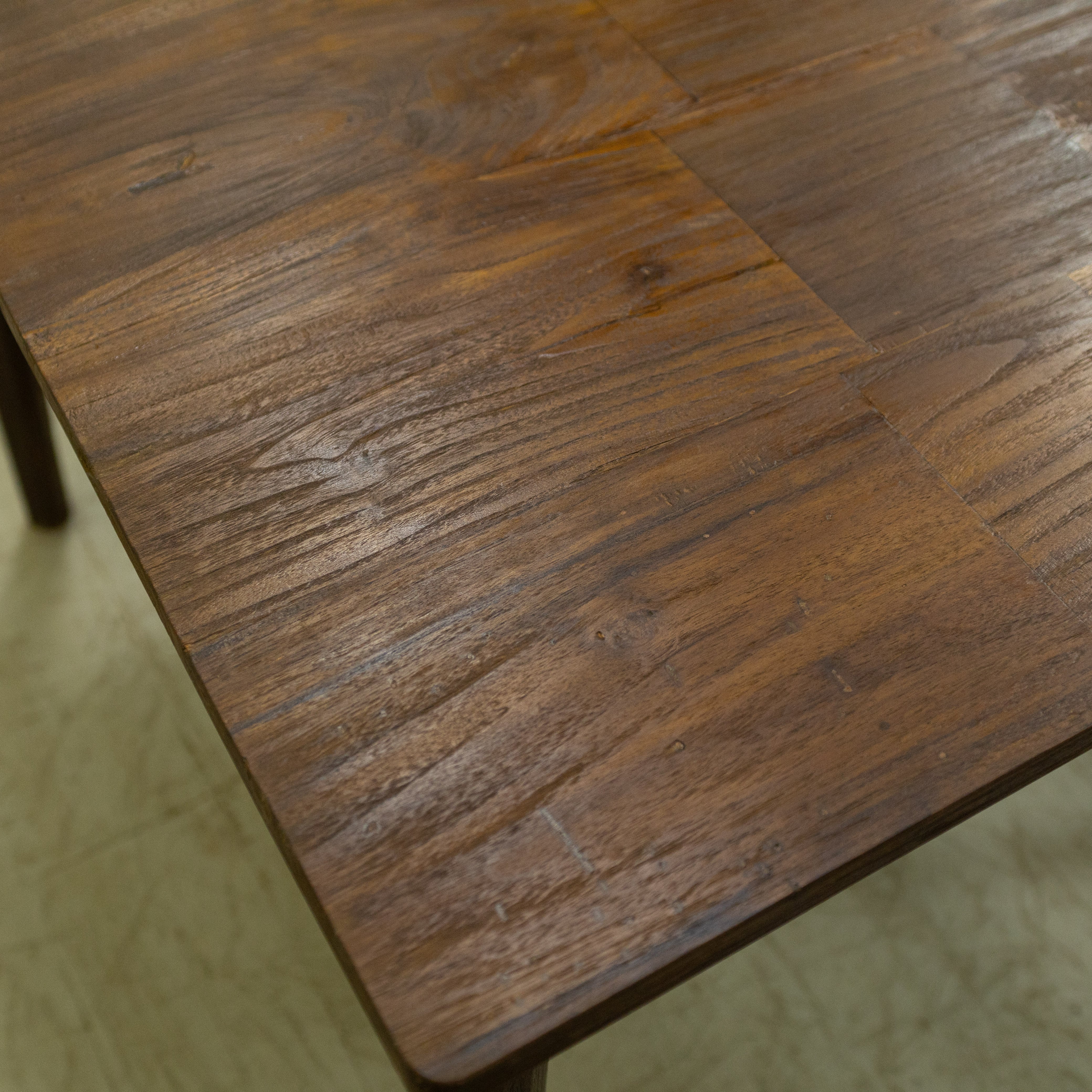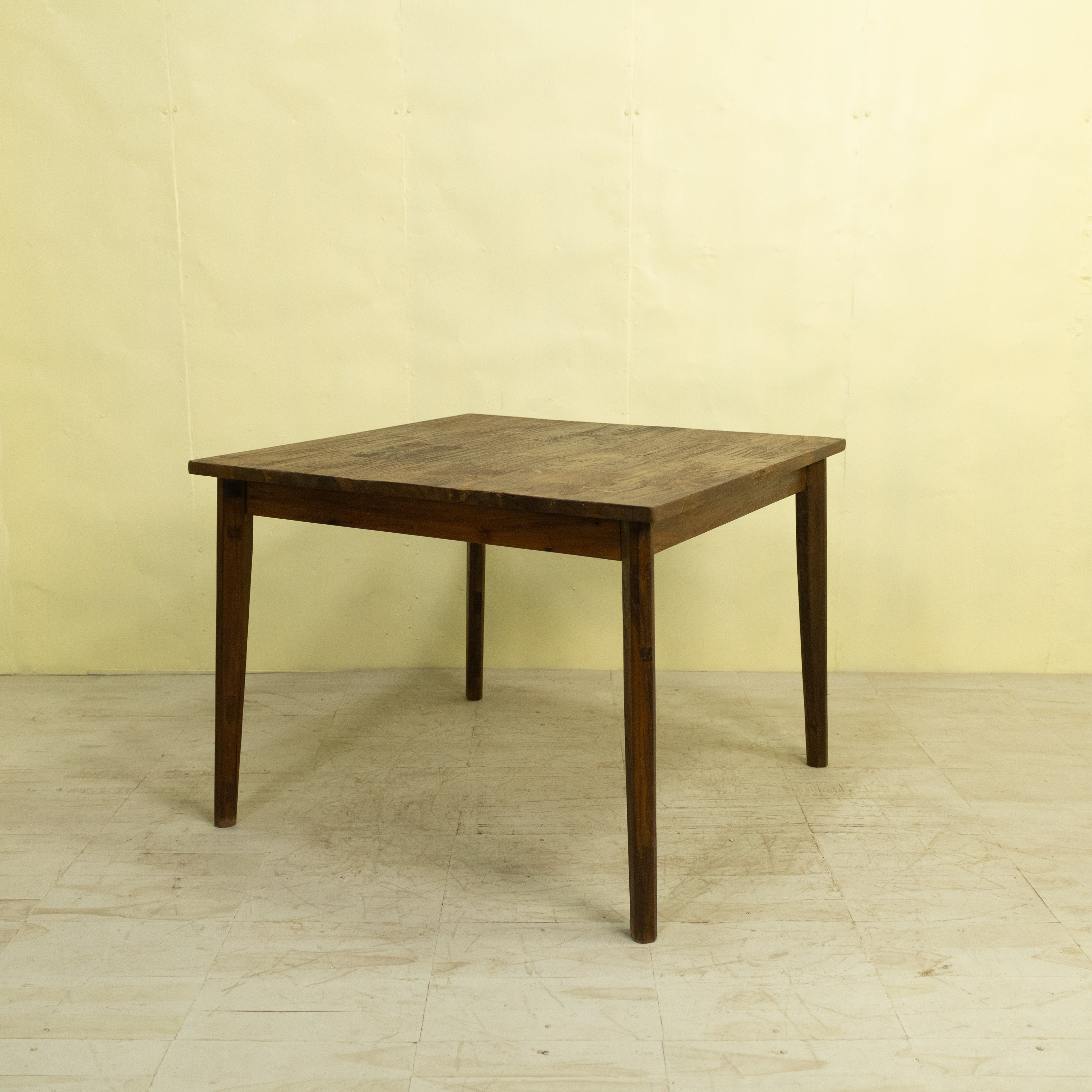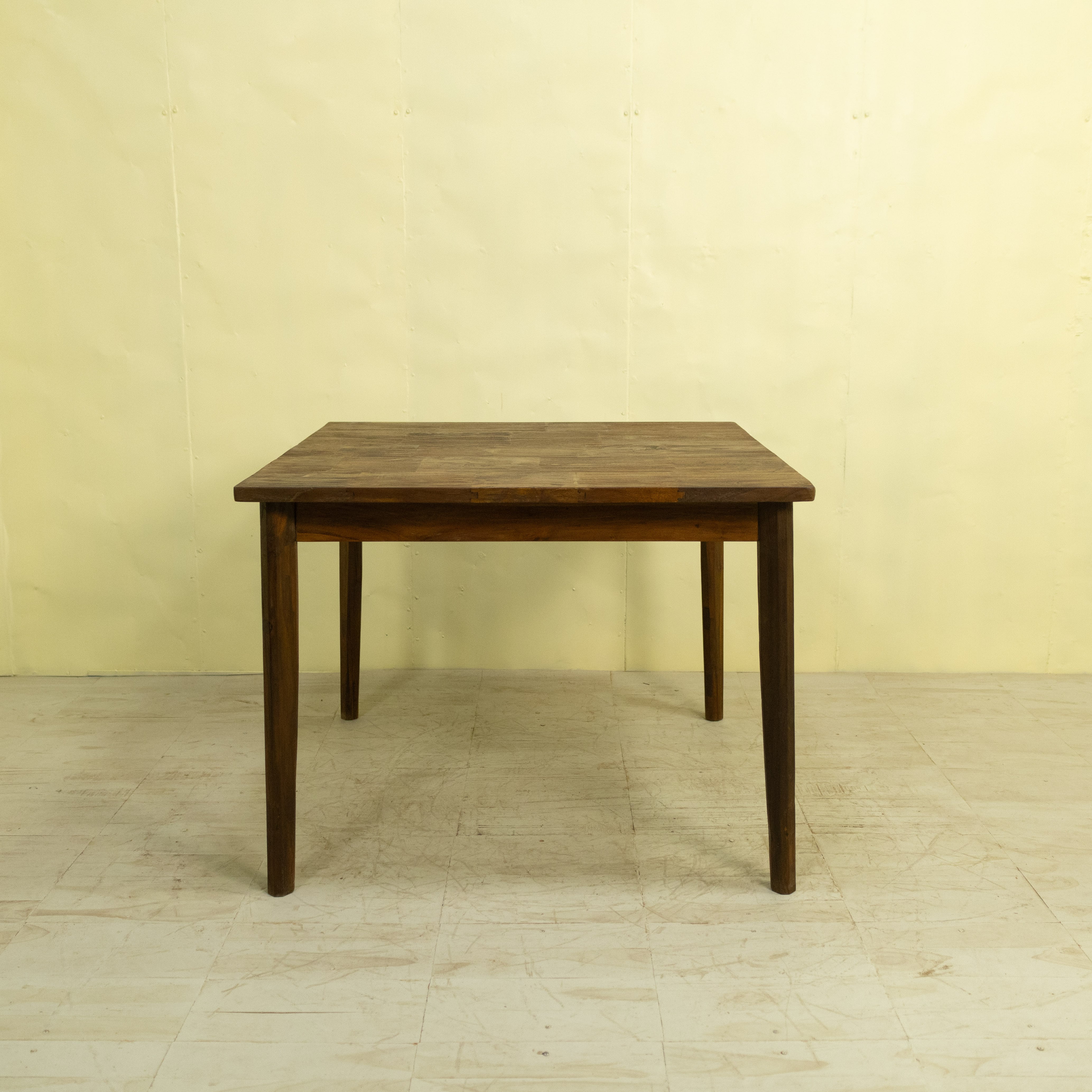 使用しているチーク材は、インドネシア現地で「ディングレ」と呼ばれる背のないベンチの古材です。ディングレは、かつてジャワの多くの家庭や食堂で日常的に使われていた、非常にポピュラーなインテリアでした。本製品は、その歴史あるベンチ材の短い端材を天板へと再生した、サステナブルなプロダクトです。