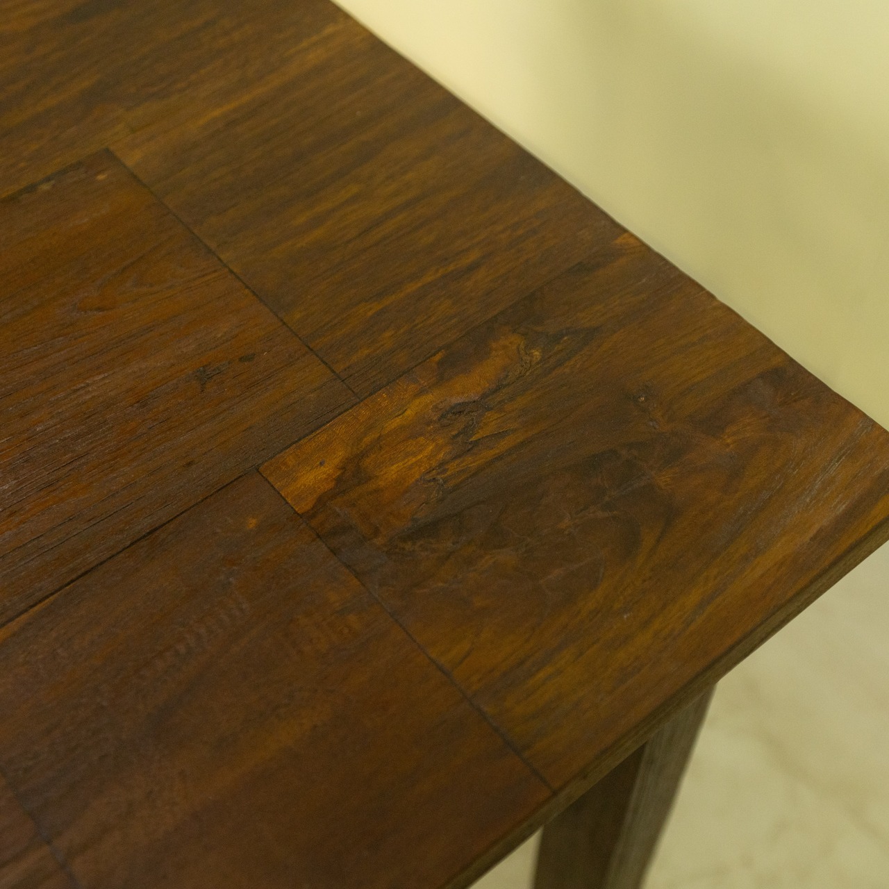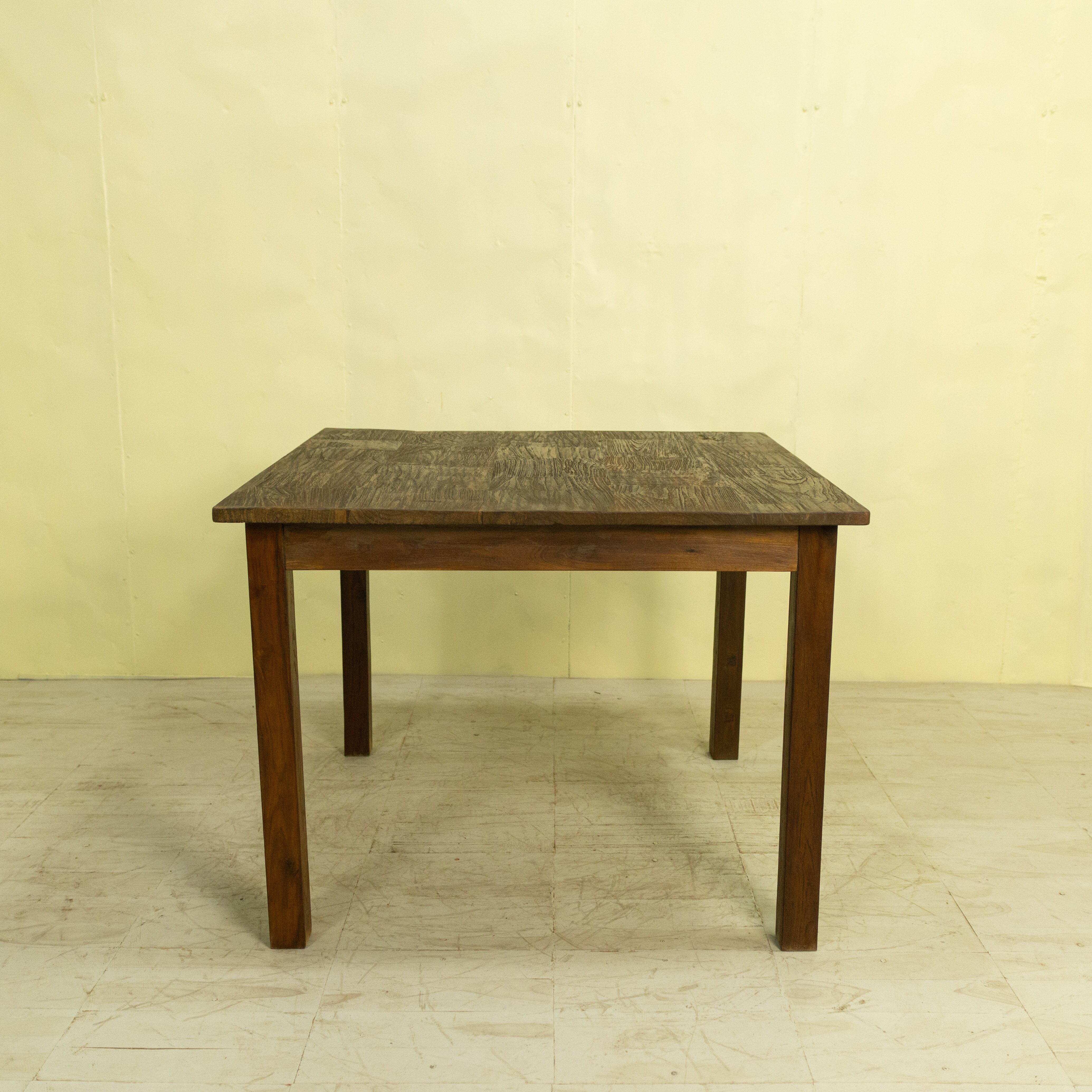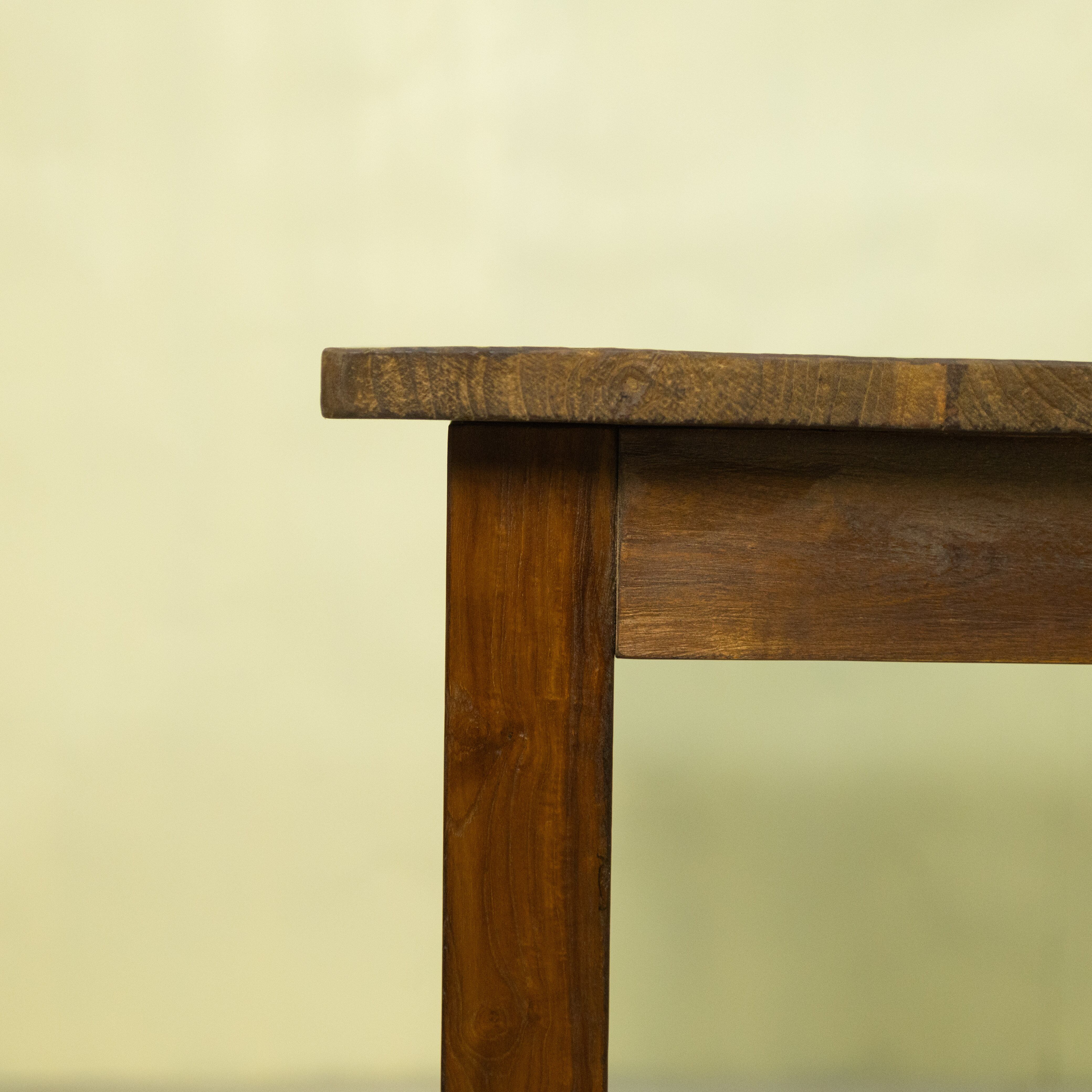 使用しているチーク材は、インドネシア現地で「ディングレ」と呼ばれる背のないベンチの古材です。ディングレは、かつてジャワの多くの家庭や食堂で日常的に使われていた、非常にポピュラーなインテリアでした。本製品は、その歴史あるベンチ材の短い端材を天板へと再生した、サステナブルなプロダクトです。