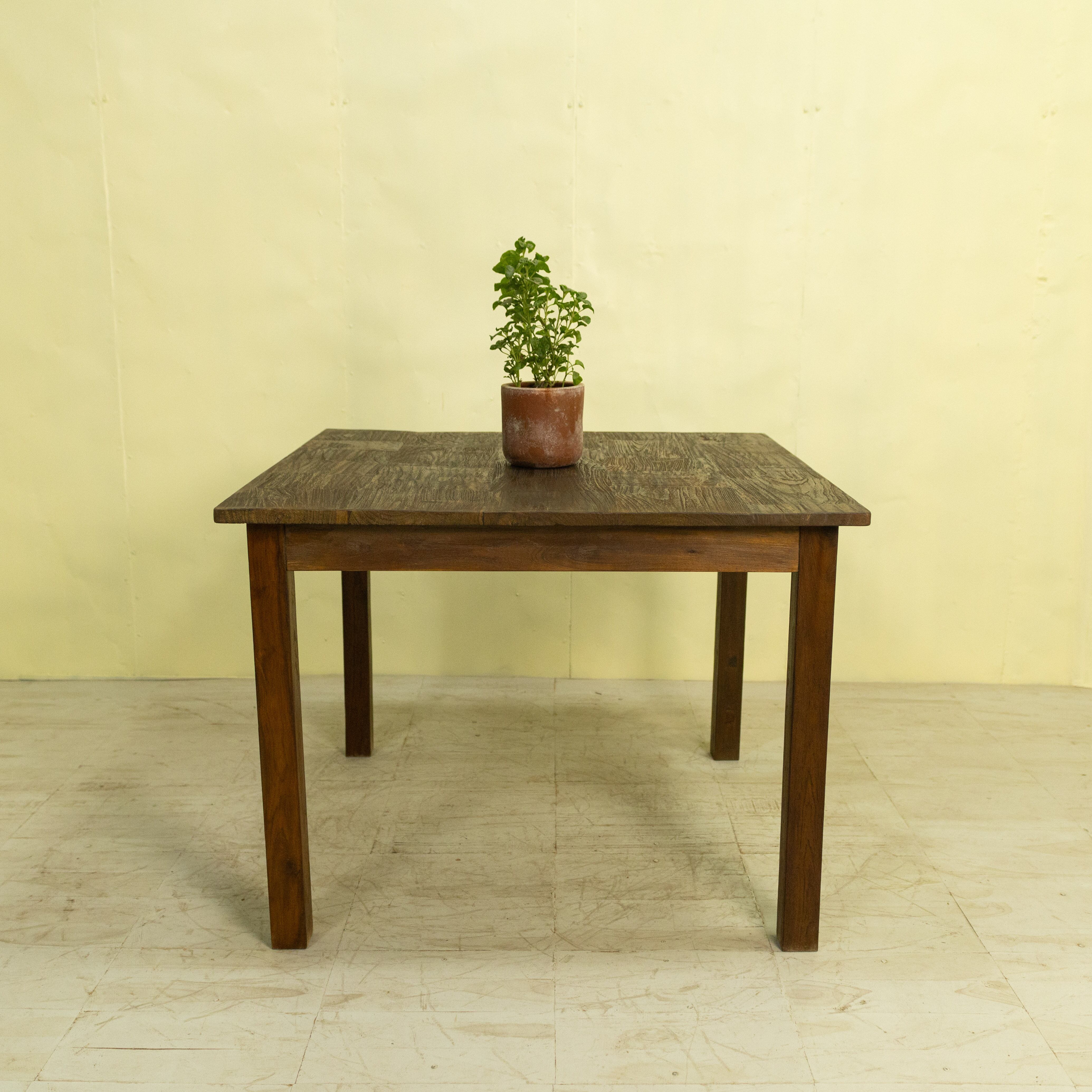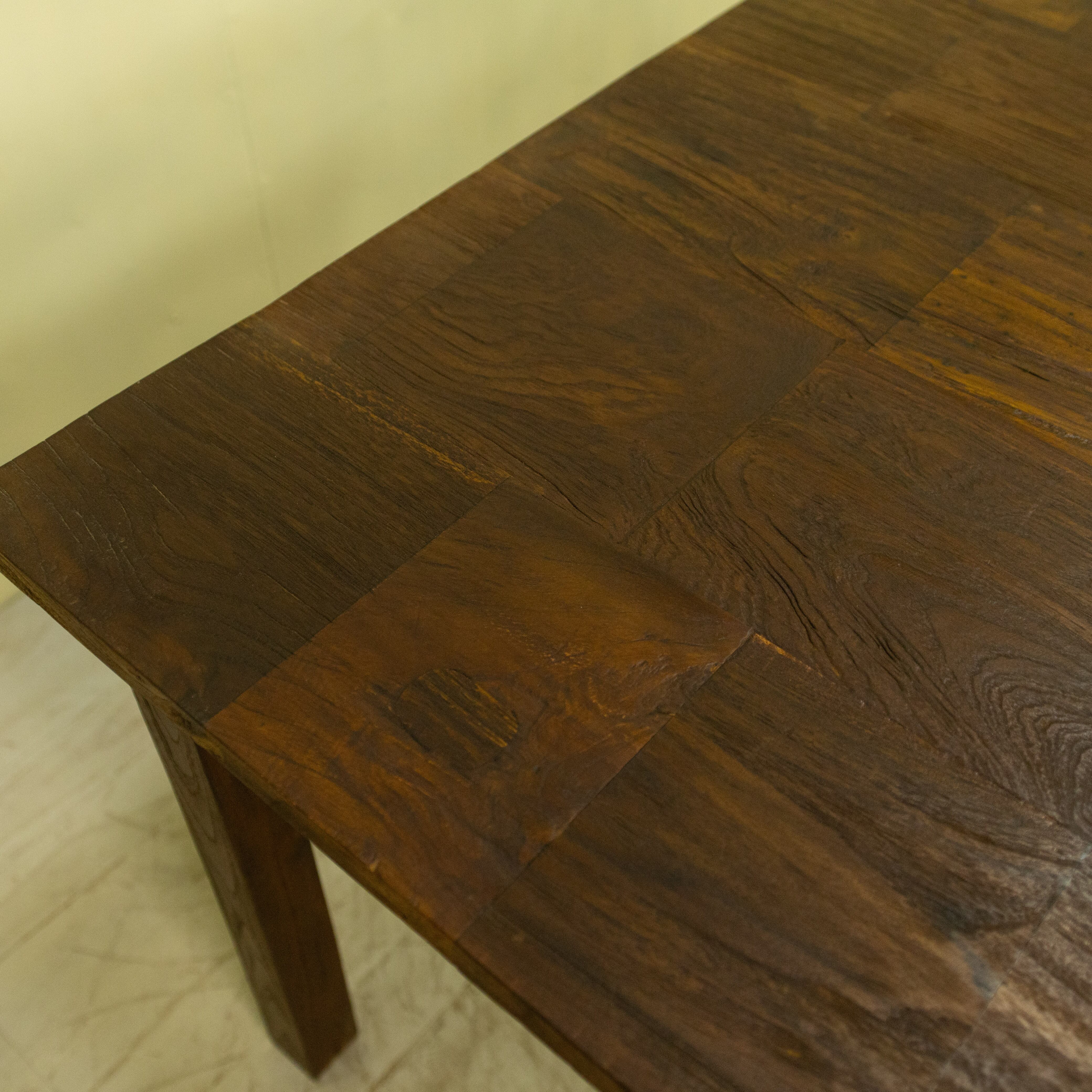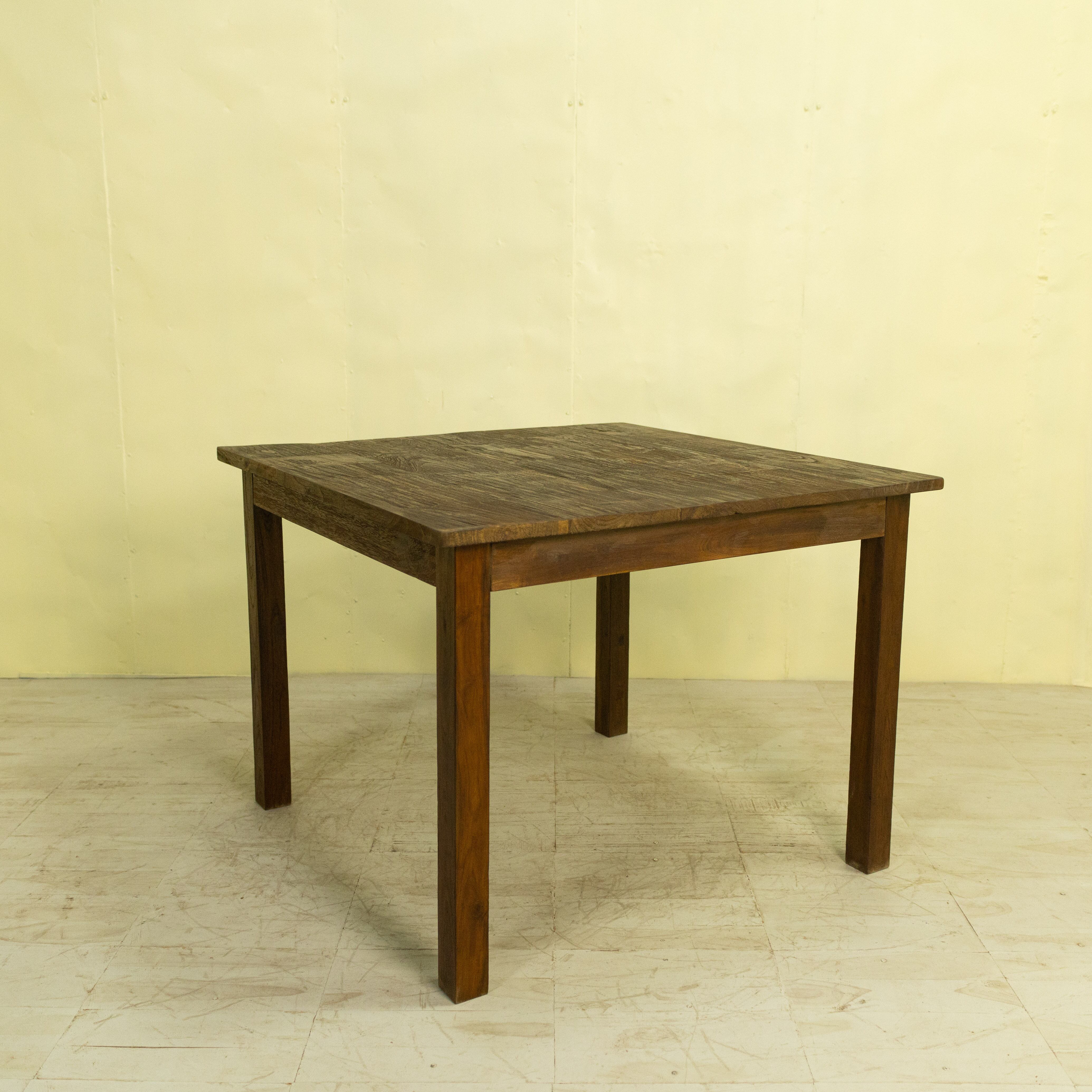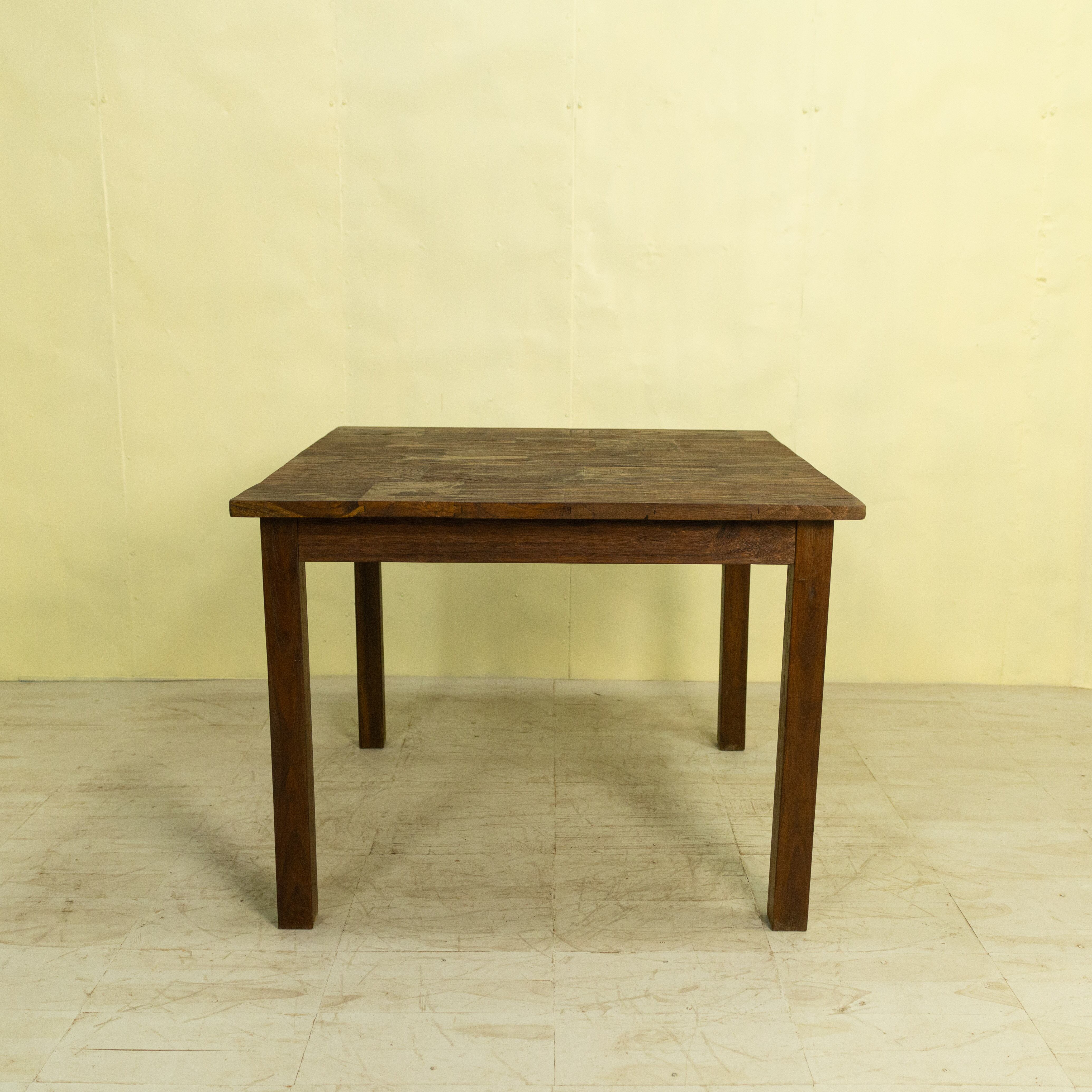 使用しているチーク材は、インドネシア現地で「ディングレ」と呼ばれる背のないベンチの古材です。ディングレは、かつてジャワの多くの家庭や食堂で日常的に使われていた、非常にポピュラーなインテリアでした。本製品は、その歴史あるベンチ材の短い端材を天板へと再生した、サステナブルなプロダクトです。