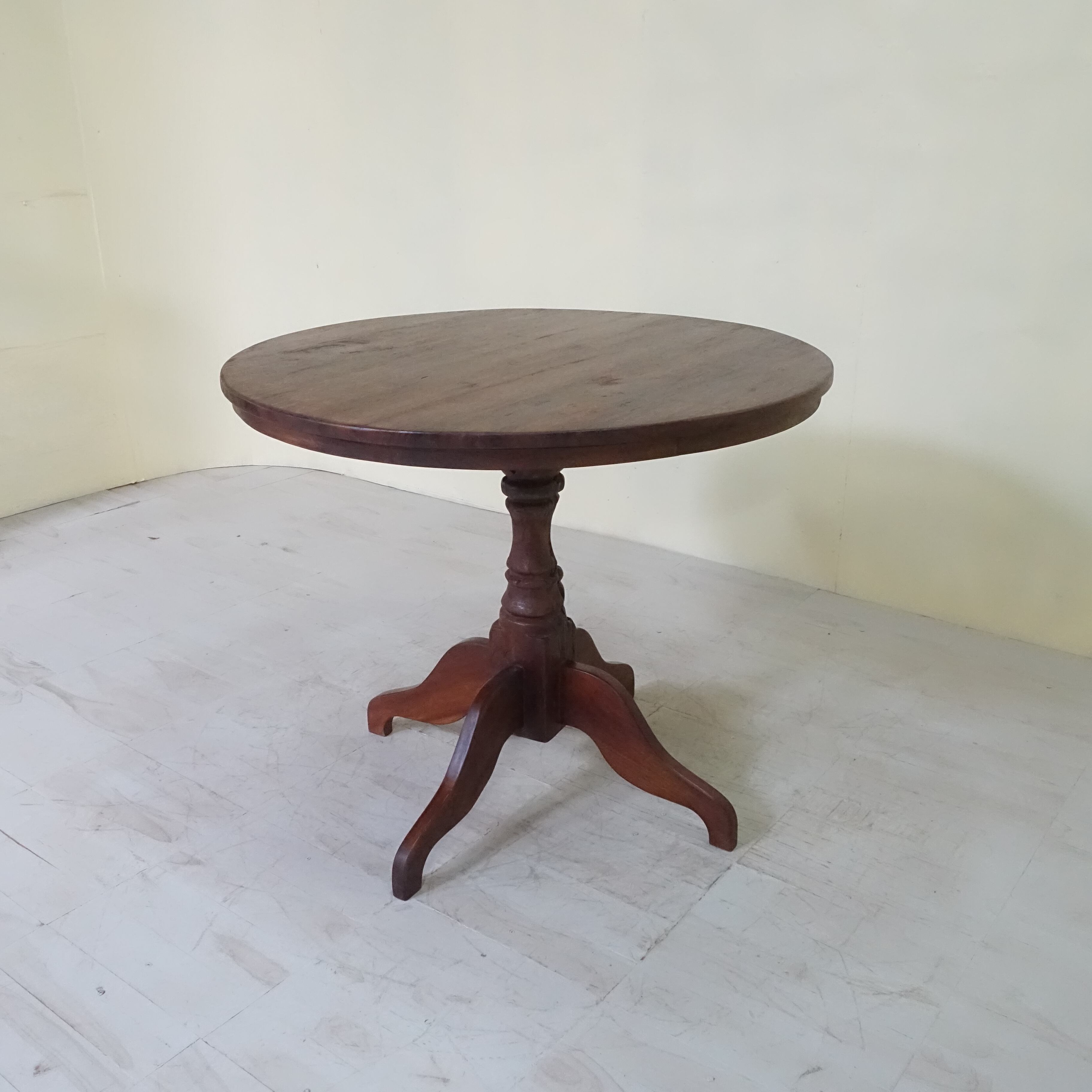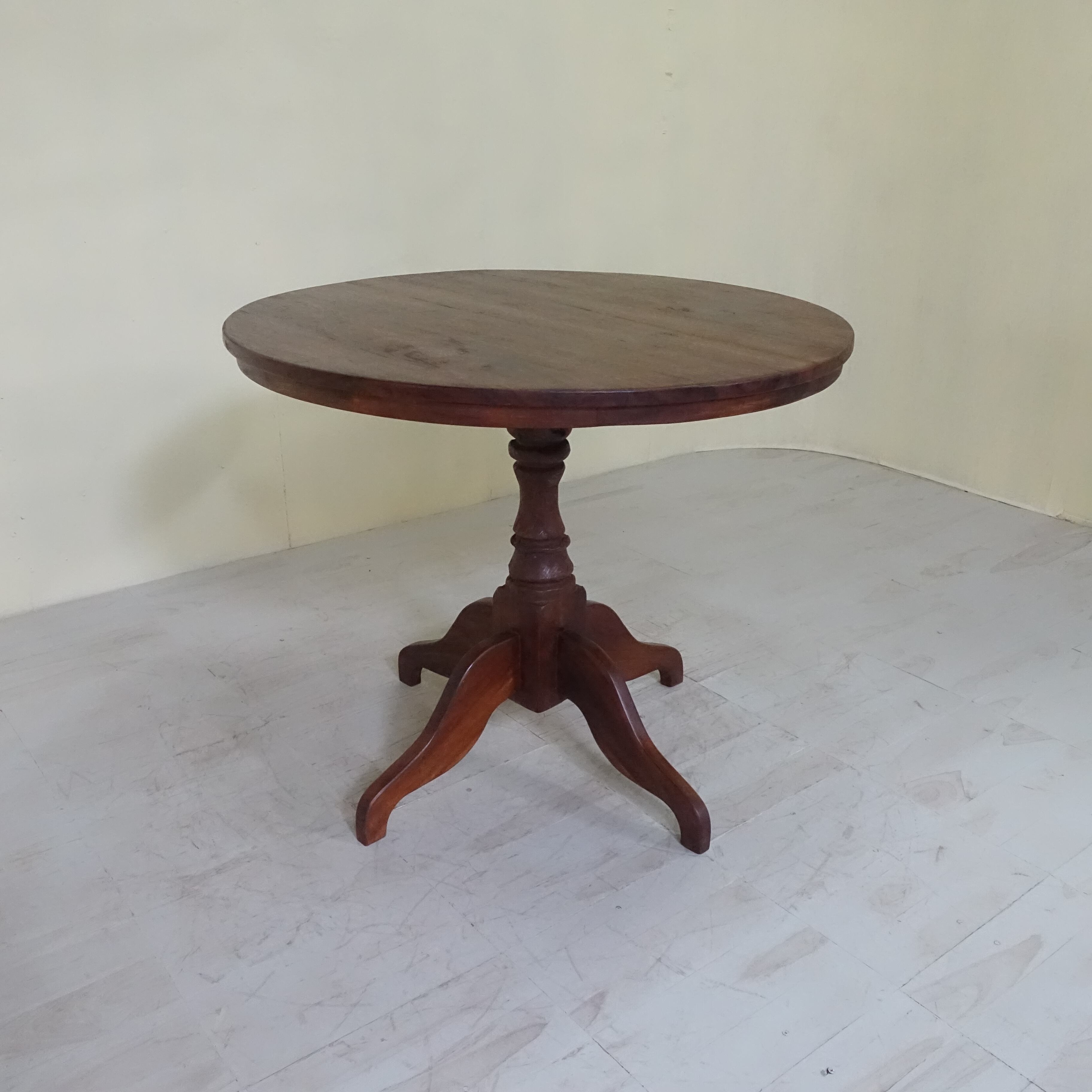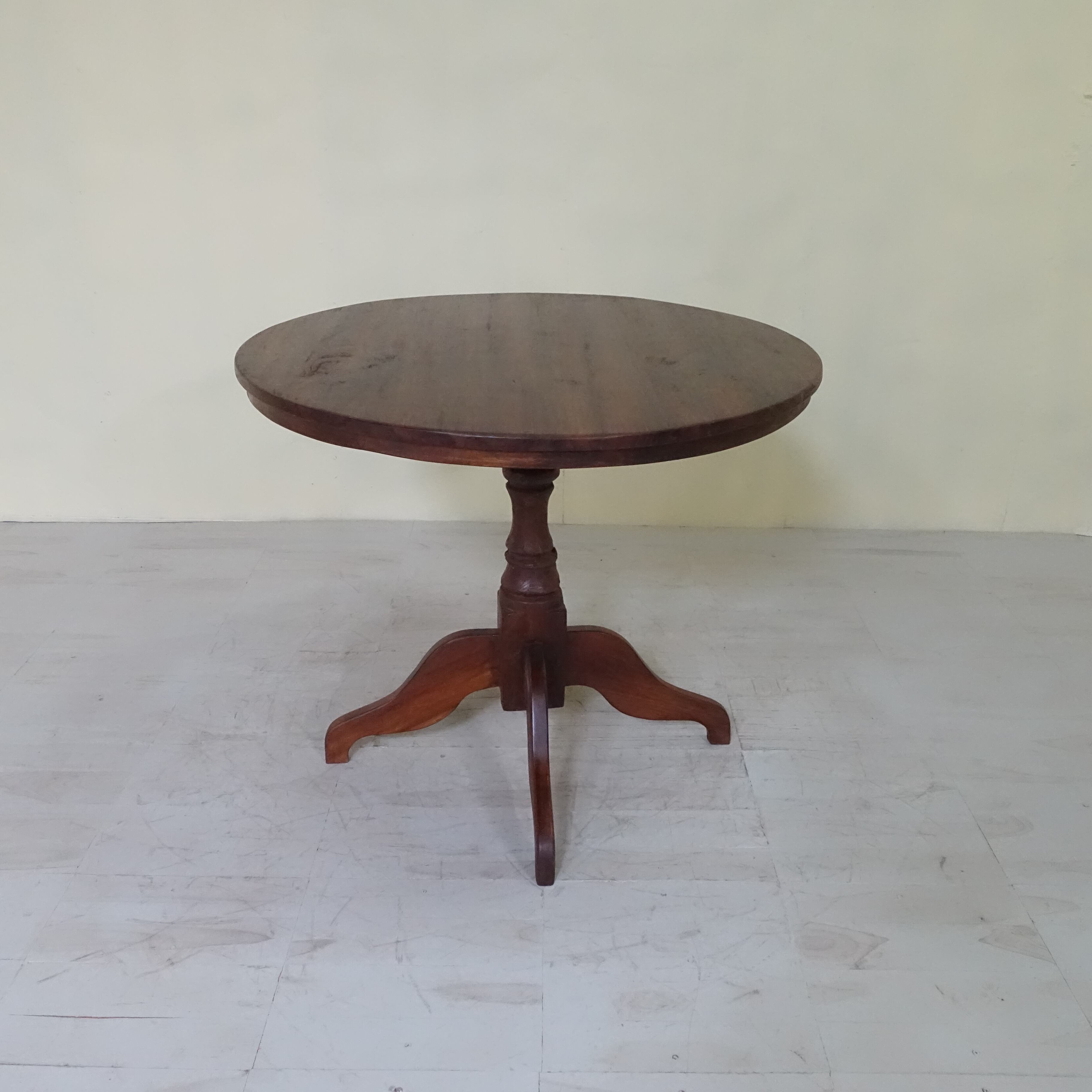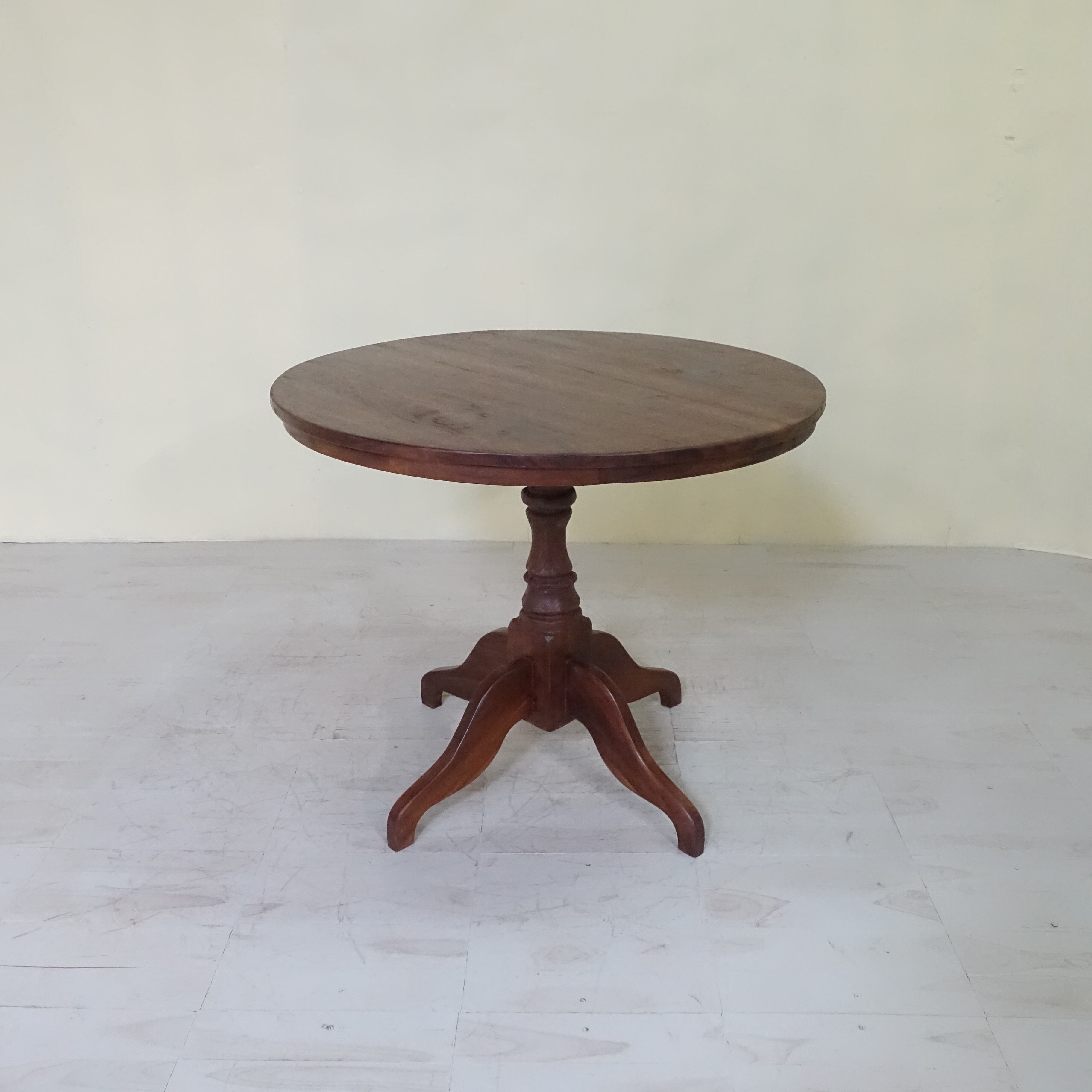 インドネシアは、約350年にわたりオランダの統治下にありました。その歴史的背景から、インドネシアで見つかる古家具には、東洋的な要素に加え、ヨーロピアンデザインの影響が色濃く感じられます。本品もまた、そうした時代の空気を纏った一台といえるでしょう。