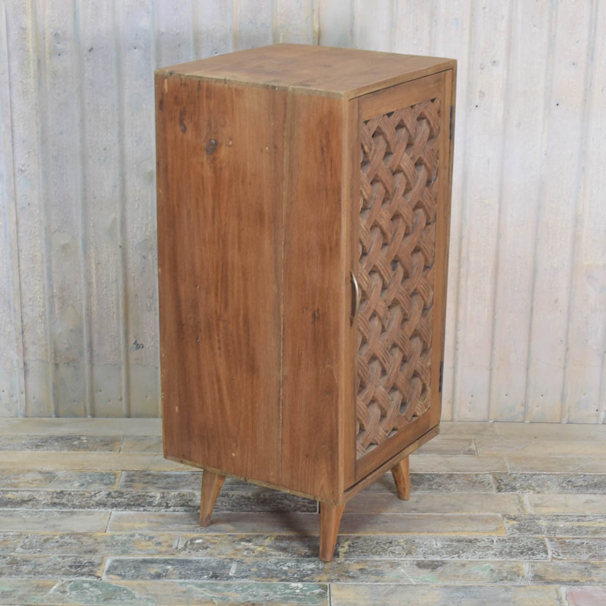 かご目の彫刻にハの字のテーパード脚が個性的。